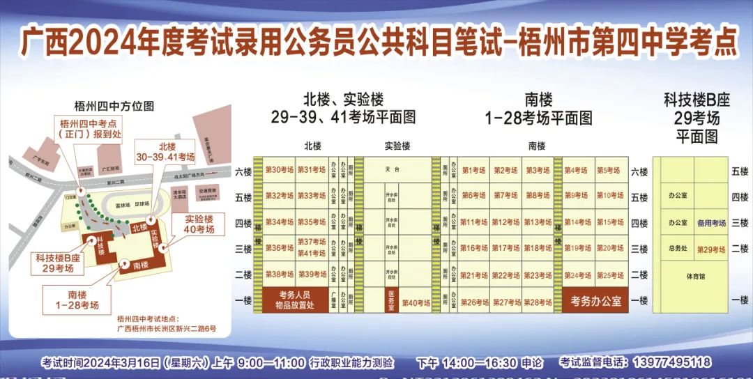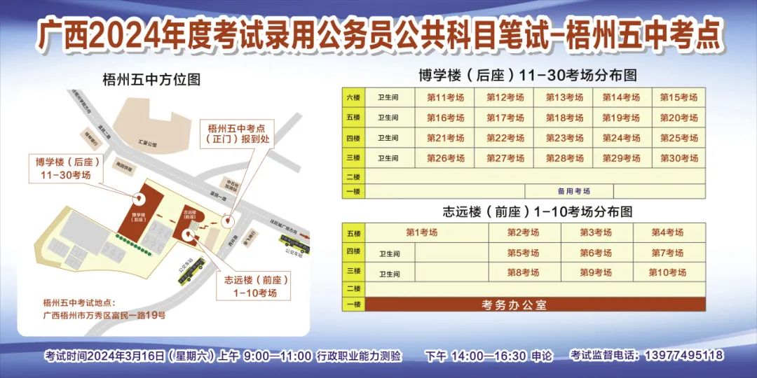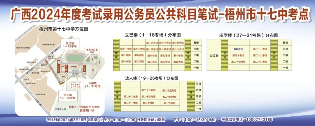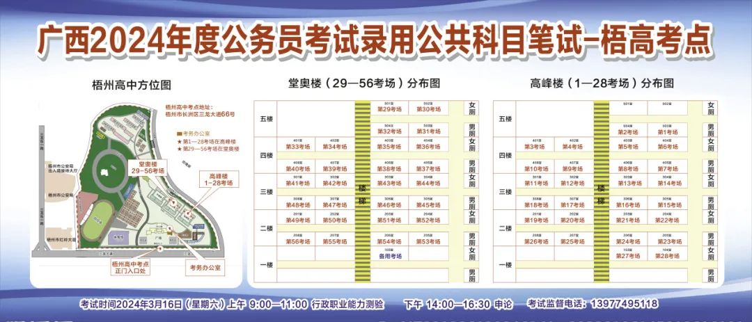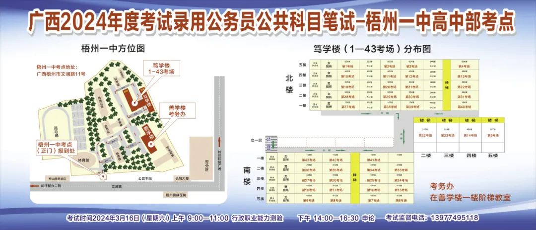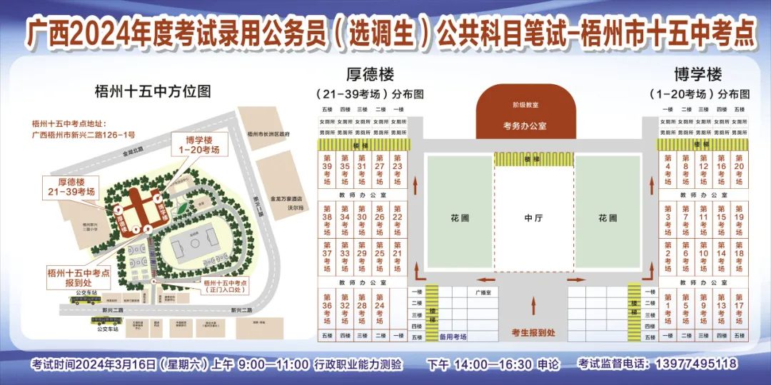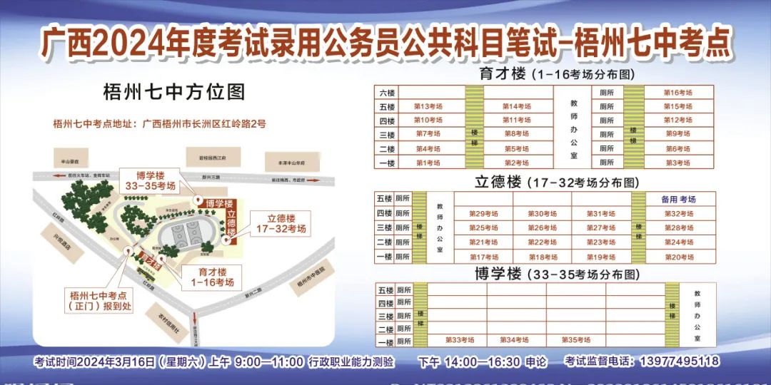 一、廣西2024年度考試錄用公務員(選調生)公共科目筆試將于3月16日舉行,梧州考區共設置9個考點,請考生提前熟悉各自考點位置、周邊環境及交通情況,考試當天提前出門做好準備,準時參加考試。特別提示:因考點停車場地有限,所有考生車輛不得進入考點,請考生規劃好前往考點的交通方式和路線。