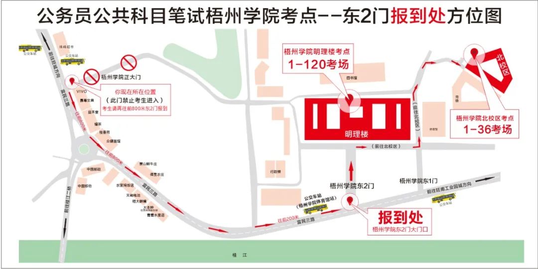 公交車參考:乘坐10路、32路、49路、49路延長線、蒼梧城鄉6路到梧州學院體育館站,下車后步行約200米到達梧州學院東大門。考生統一在梧州學院東大門進入,考點門口處于交通干道,送考車輛只能在東門外短暫停留,梧州學院南門及其他門無法核驗考生身份。從東大門進入明理教學樓考點考場步行約5分鐘,進入北校區教學樓考點考場步行約15分鐘,請規劃好進入考點時間。