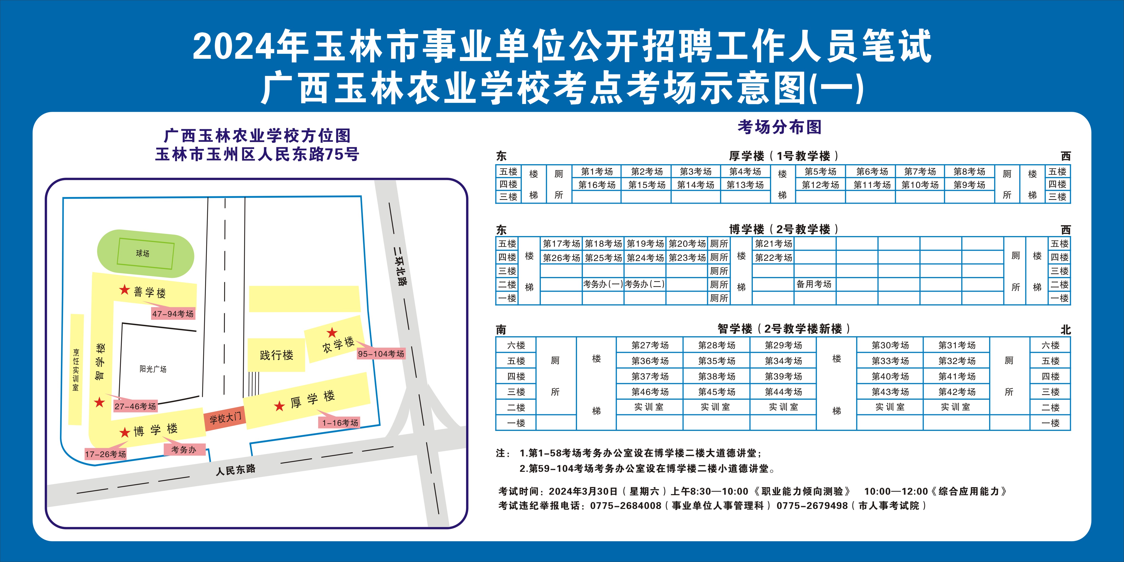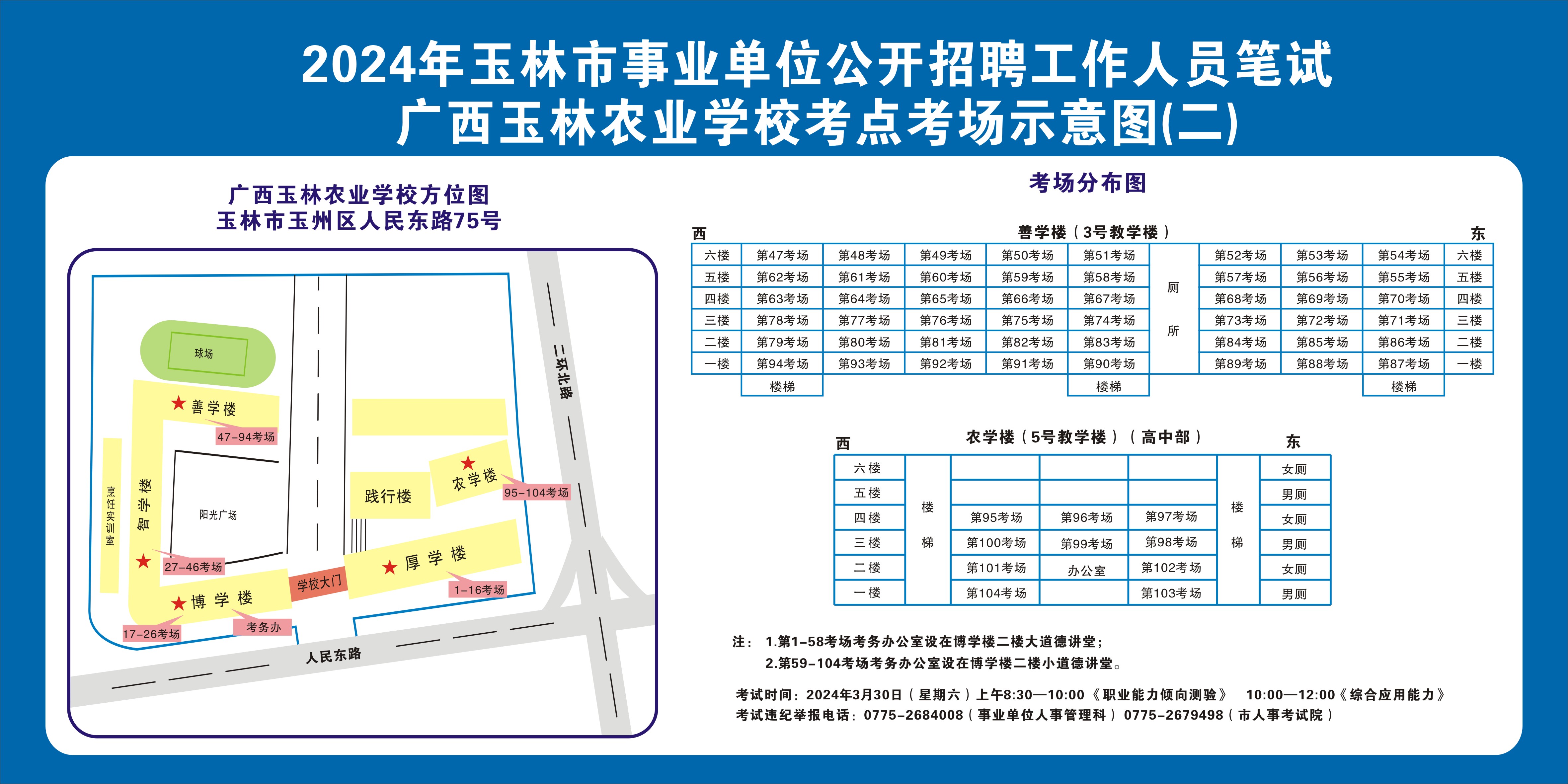 需要特別注意的是:玉林市第一職業中等專業學校考點是設在該校的東校區(人民東路東235號);玉林市第一中學考點是設在該校的運嶺路校區(二環北路1228號)!