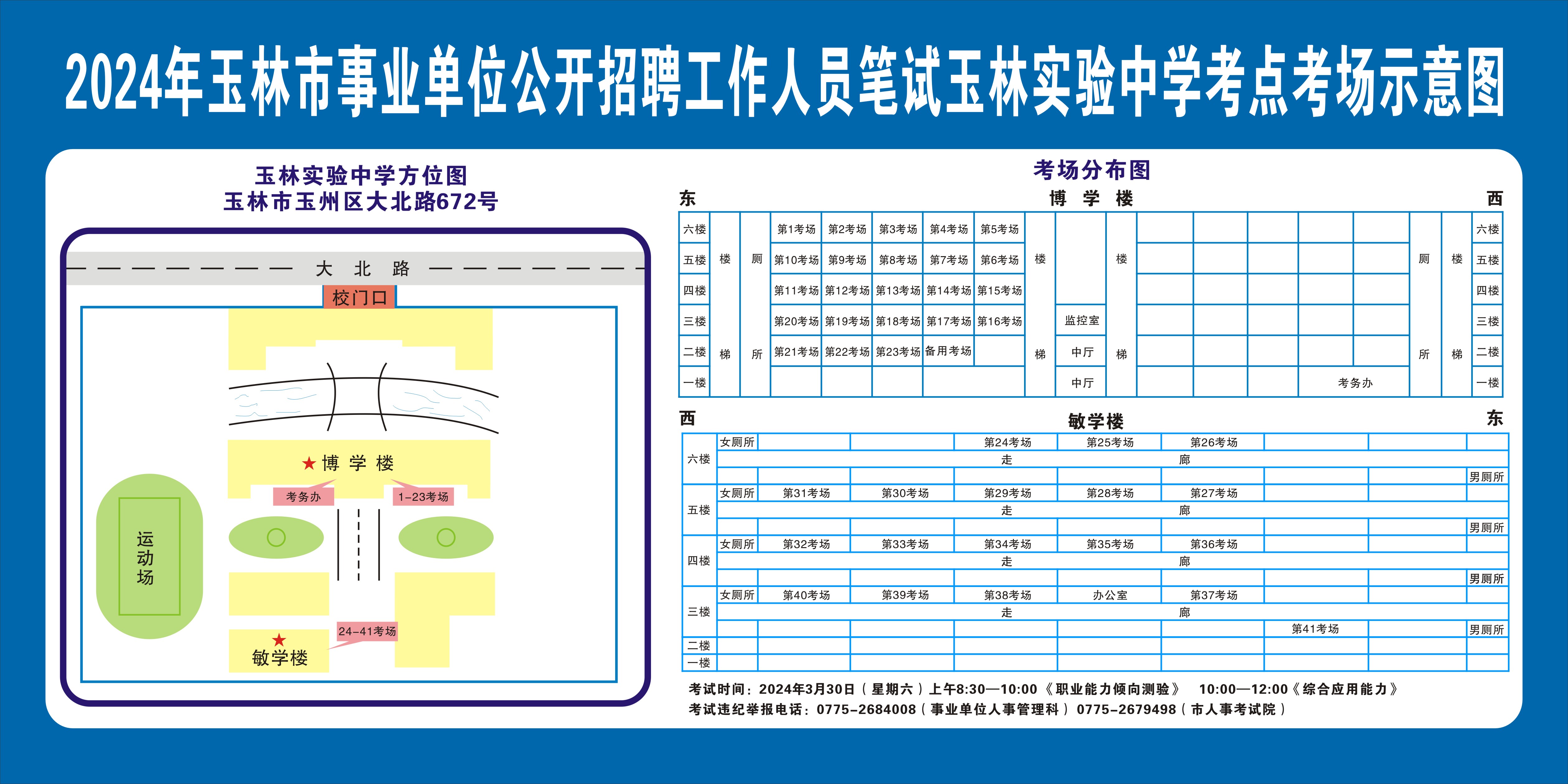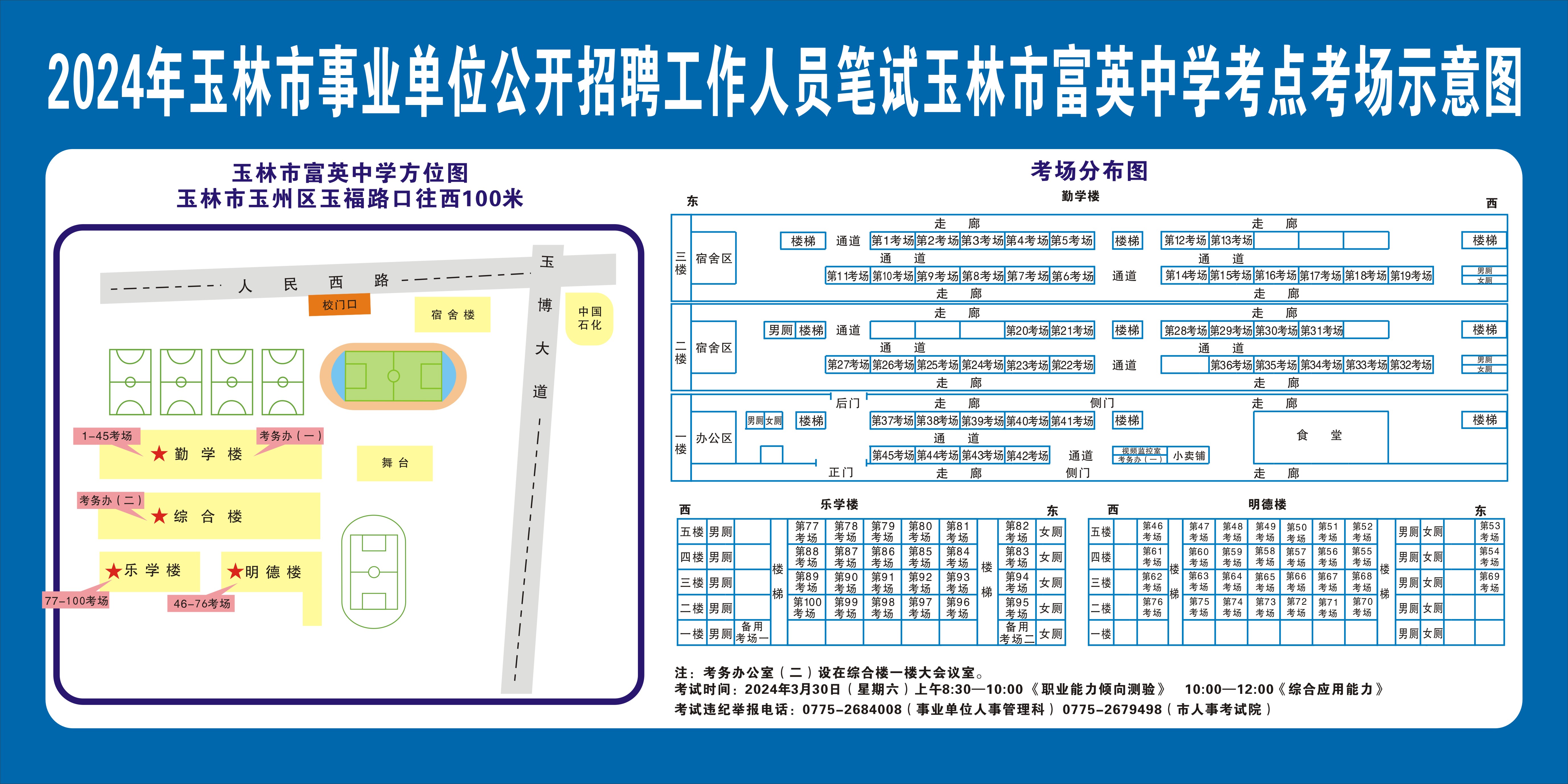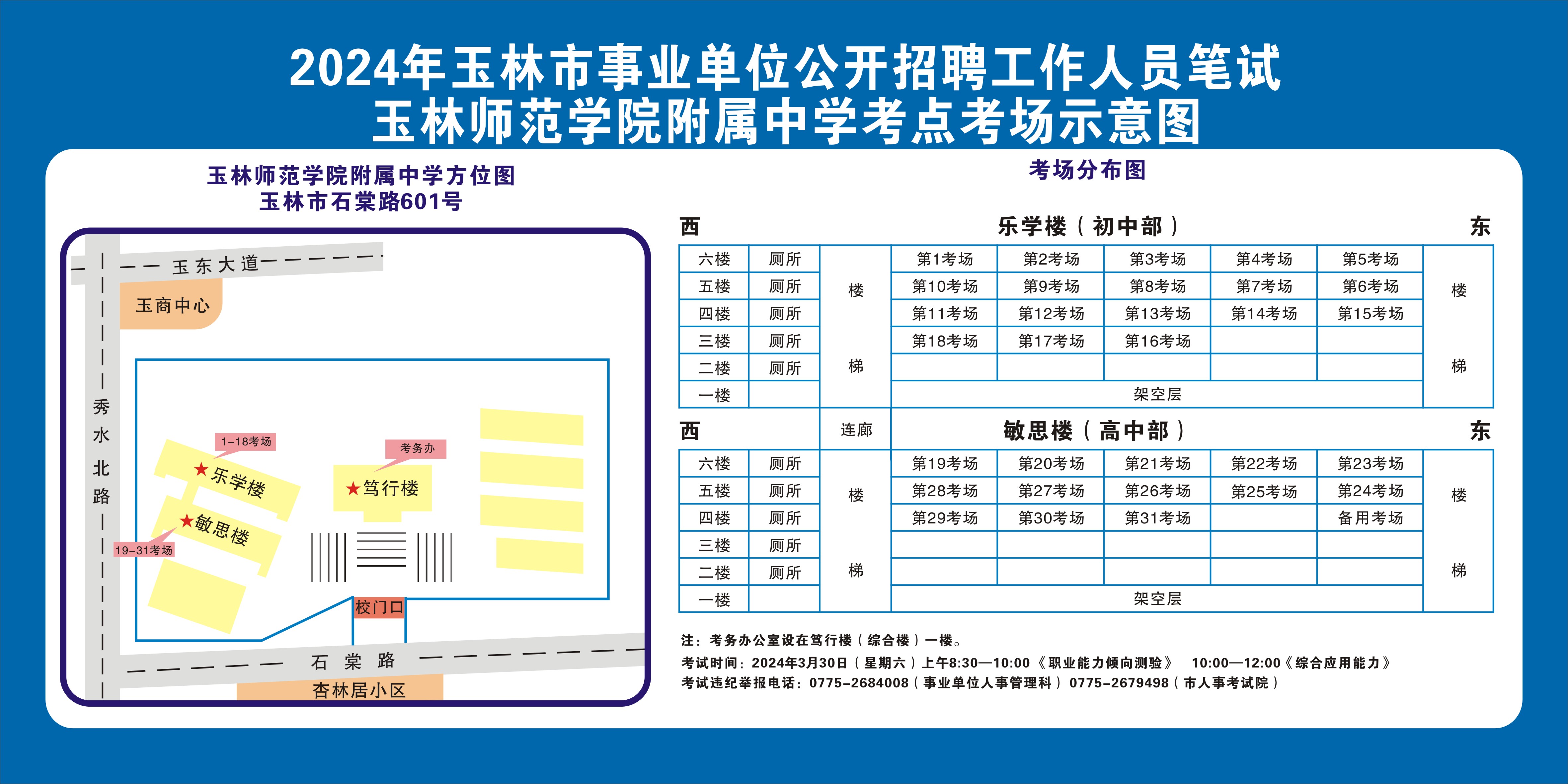 請考生注意查看“考點考場示意圖”,提前熟悉考點地址、交通路線和考場分布情況。除考試當天考生可以進入考點外,考生不得提前進入考點查看考場(學校將在大門處擺放考場分布示意圖),13個考點的考場布置情況如下: