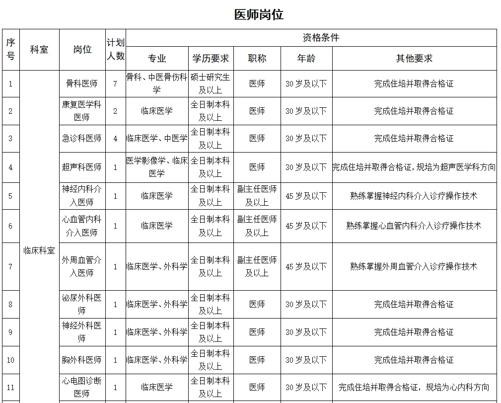 2.條件要求:具備碩士研究生及以上學歷(部分緊缺專業可放寬至本科學歷),年齡不超35歲;專業理論功底扎實,業務技術過硬,有良好的團隊合作精神;有二級甲等及以上醫院工作5年及以上經歷,并有三級甲等醫院進修6個月及以上經歷。