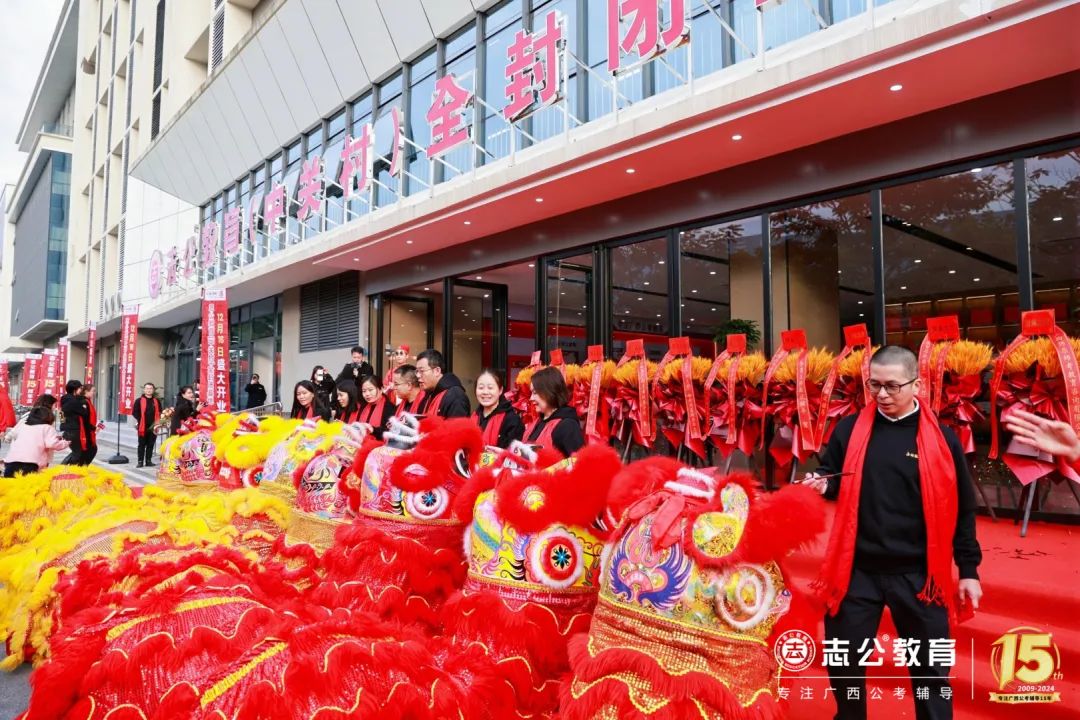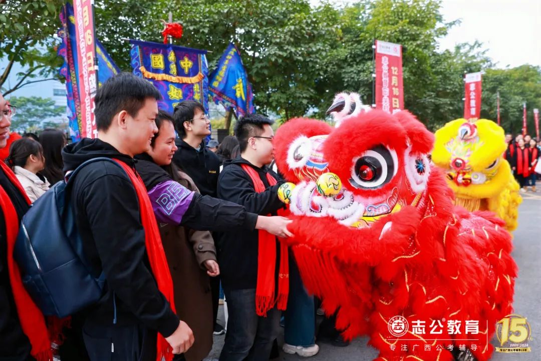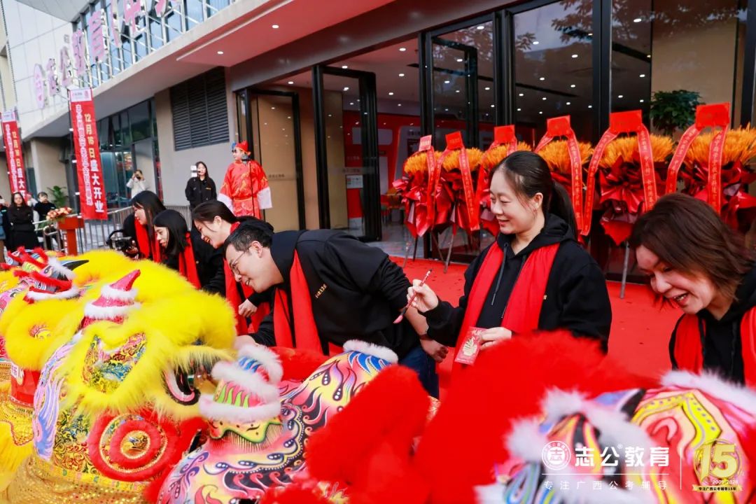 志公教育還專門請(qǐng)來了舞獅隊(duì),舞獅點(diǎn)睛是重頭戲,董事長李勇帶領(lǐng)著公司領(lǐng)導(dǎo)們手持毛筆蘸取朱砂,對(duì)獅頭天庭進(jìn)行點(diǎn)睛。