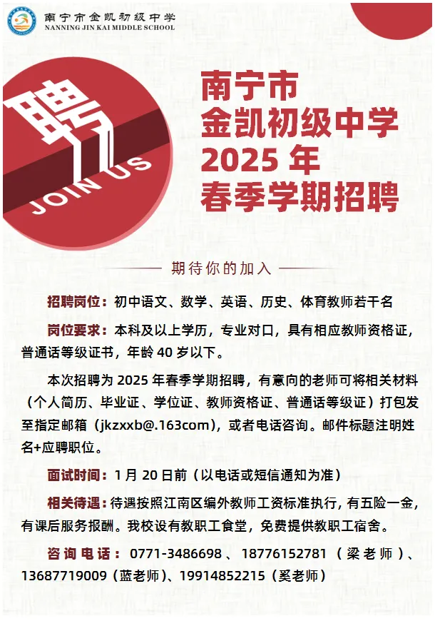 原文標題:南寧市金凱初級中學2025年春季學期招聘