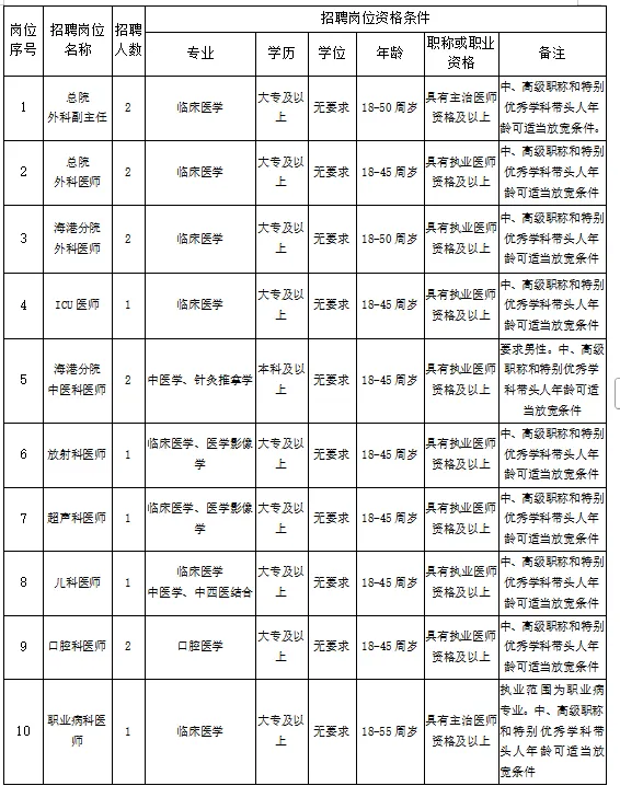 一、招聘崗位和人數本次公開招聘涉及崗位10個,各類(級)衛生專業技術人員共15人,詳見下表。