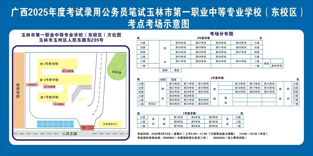 請(qǐng)?zhí)崆傲私獗救怂诳键c(diǎn)具體位置,熟悉考點(diǎn)周邊情況,特別是考點(diǎn)周邊的食宿、交通情況,合理做好食宿安排和出行計(jì)劃。需要特別注意的是:玉林市第一職業(yè)中等專業(yè)學(xué)校考點(diǎn)是設(shè)在該校的東校區(qū)(人民東路東235號(hào));玉林市第一中學(xué)考點(diǎn)是設(shè)在該校的運(yùn)嶺路校區(qū)(二環(huán)北路1228號(hào))!