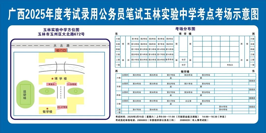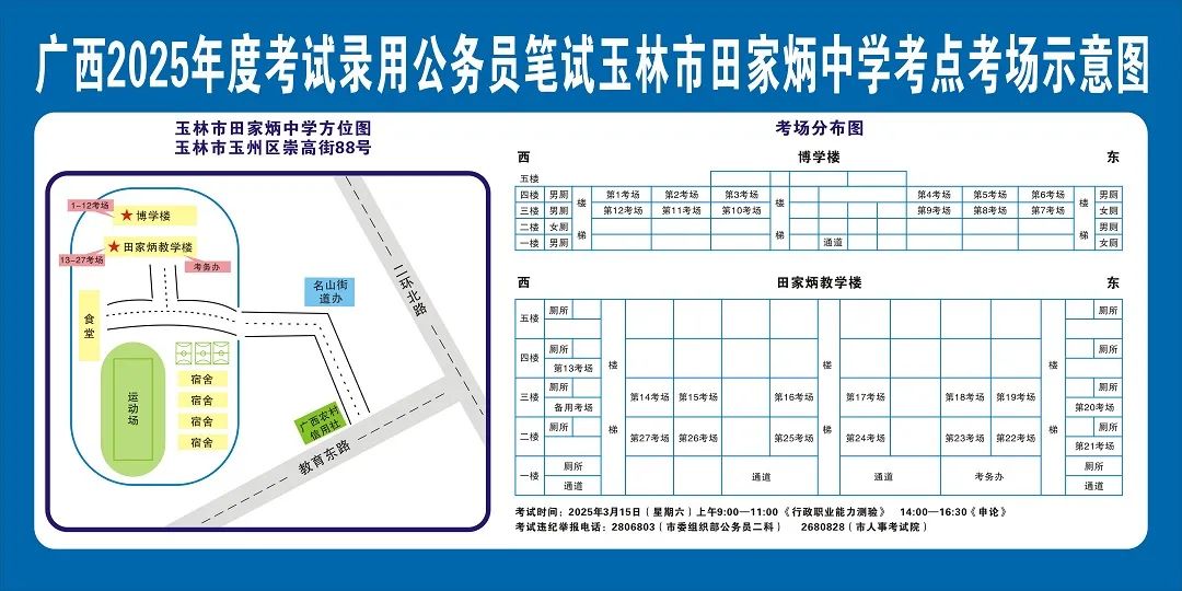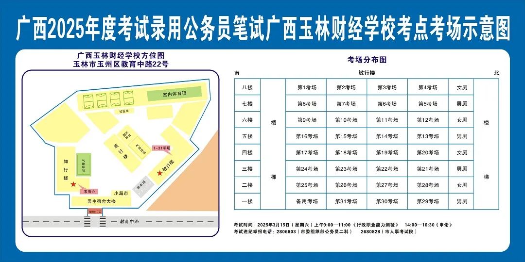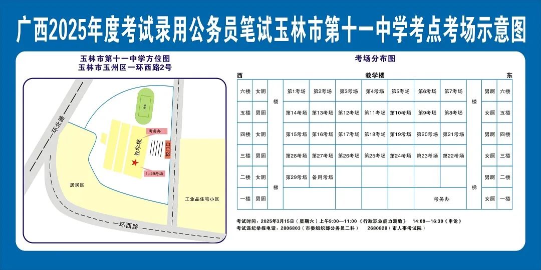 除考試當(dāng)天考生可以進(jìn)入考點(diǎn)外,考生不得提前進(jìn)入考點(diǎn)查看考場(chǎng)(學(xué)校將在大門處擺放考場(chǎng)分布示意圖),玉林考區(qū)11個(gè)考點(diǎn)的考場(chǎng)布置情況如下: