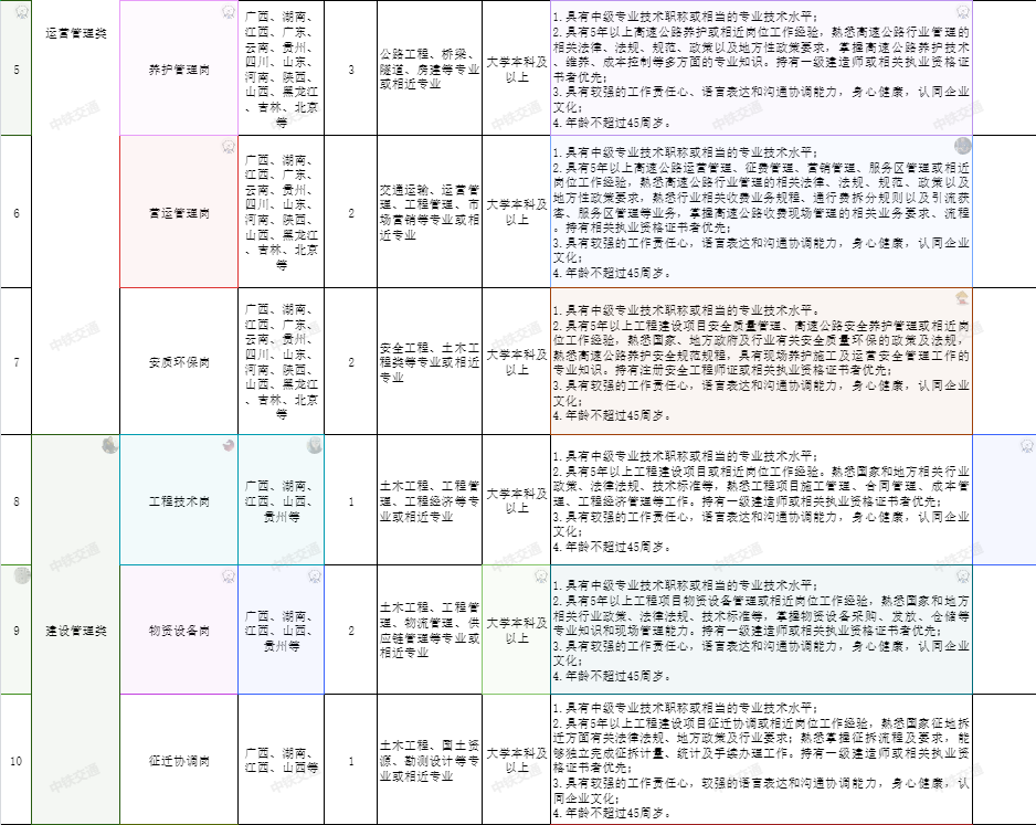 運營管理類:集團公司本部運營管理部副部長;機電維護崗;養護管理崗;營運管理崗;安質環保崗