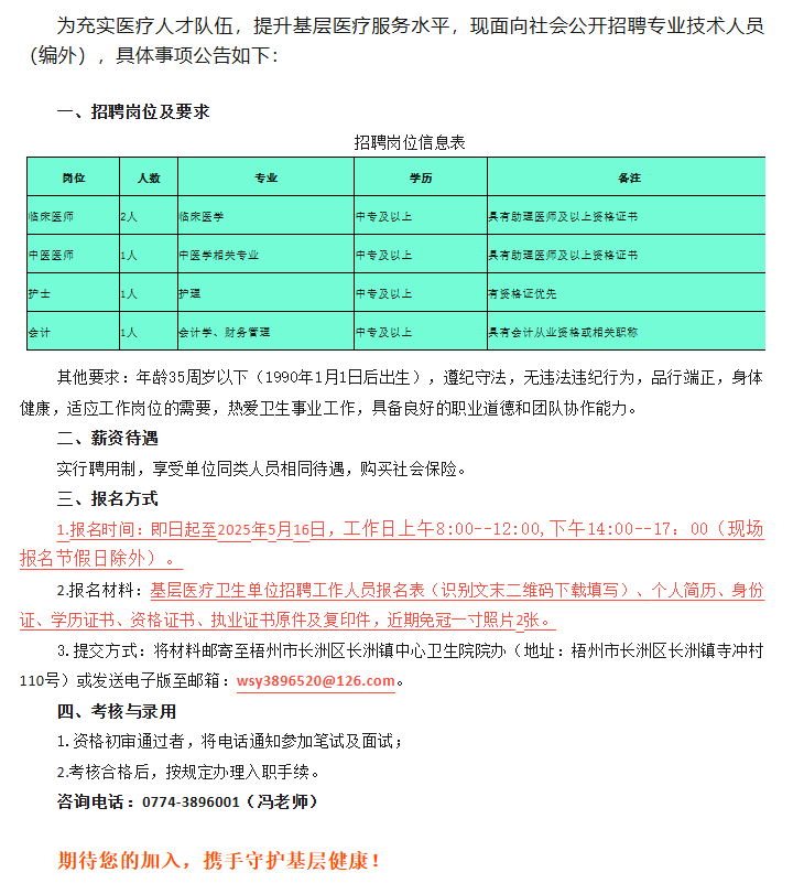 2025年梧州市長洲區長洲鎮中心衛生院公開招聘公告