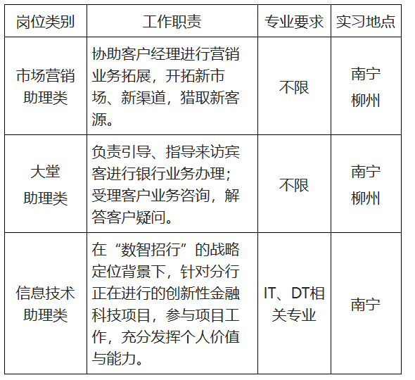 (1)方式一:招商銀行官方招聘網站:進入http://career.cmbchina.com網站點擊“校園招聘-實習生招聘-南寧分行”,申請感興趣的職位,在線注冊,投遞簡歷。