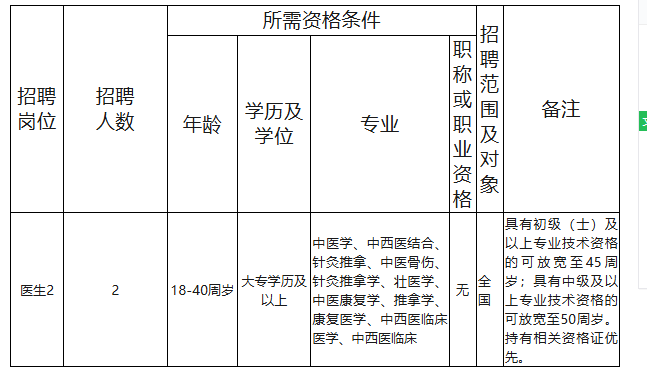 根據工作需要,決定面向社會公開招聘醫生(中醫類)2人,現將有關事項公告如下: