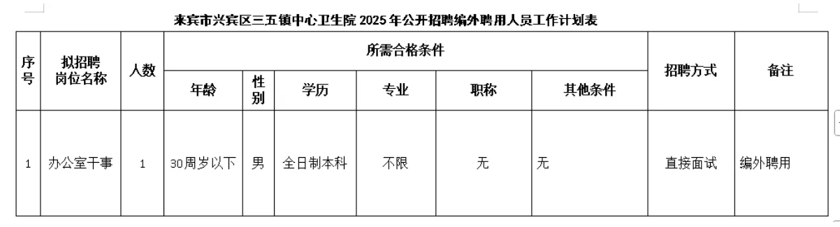 原文標題:來賓市興賓區三五鎮中心衛生院 2025年公開招聘編外工作人員公告