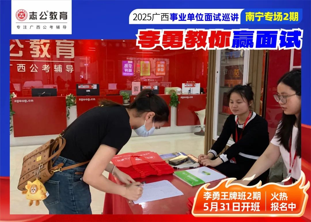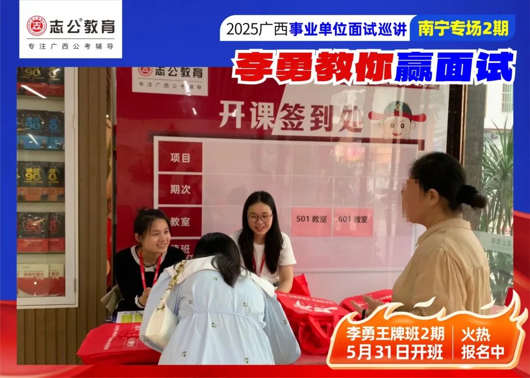 隨著2025廣西事業單位——李勇教你贏面試【南寧專場2期】線下巡講落幕,這場"面試攻堅戰",不僅點燃了備考熱情,更讓志公教育"幫助人才實現更高質量的就業"的使命,在八桂大地結出更多碩果。