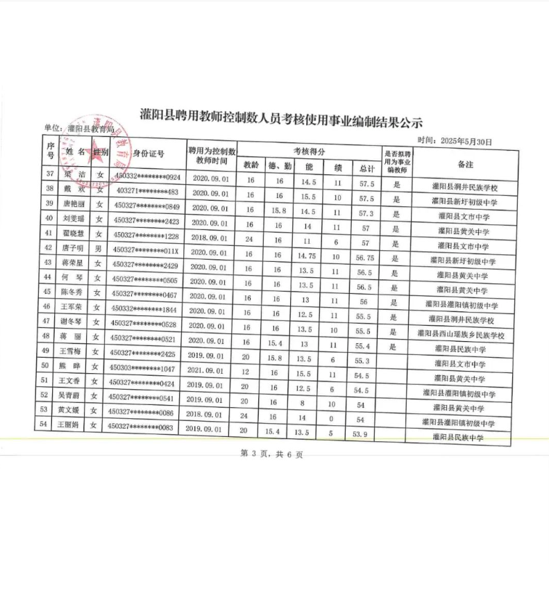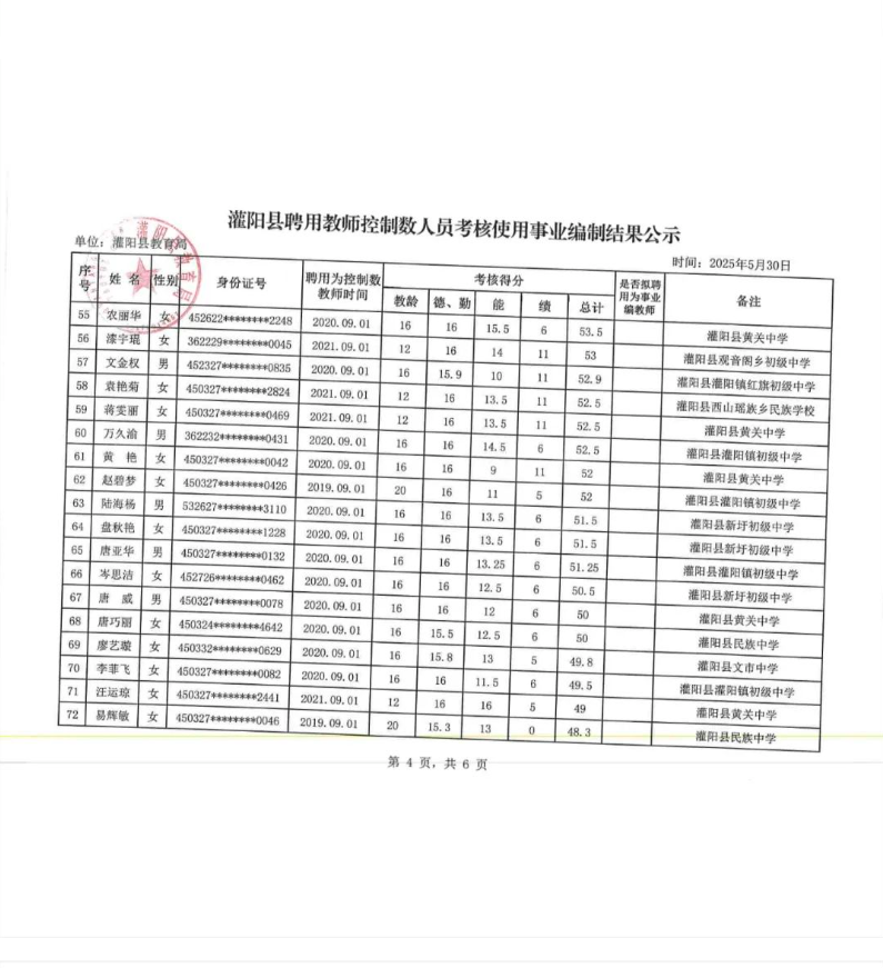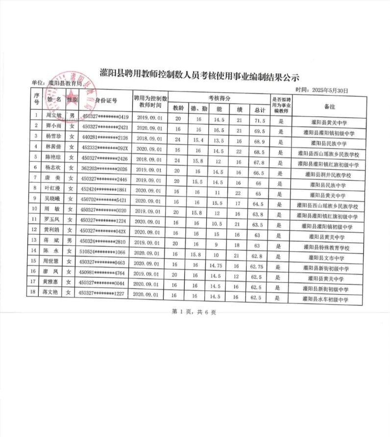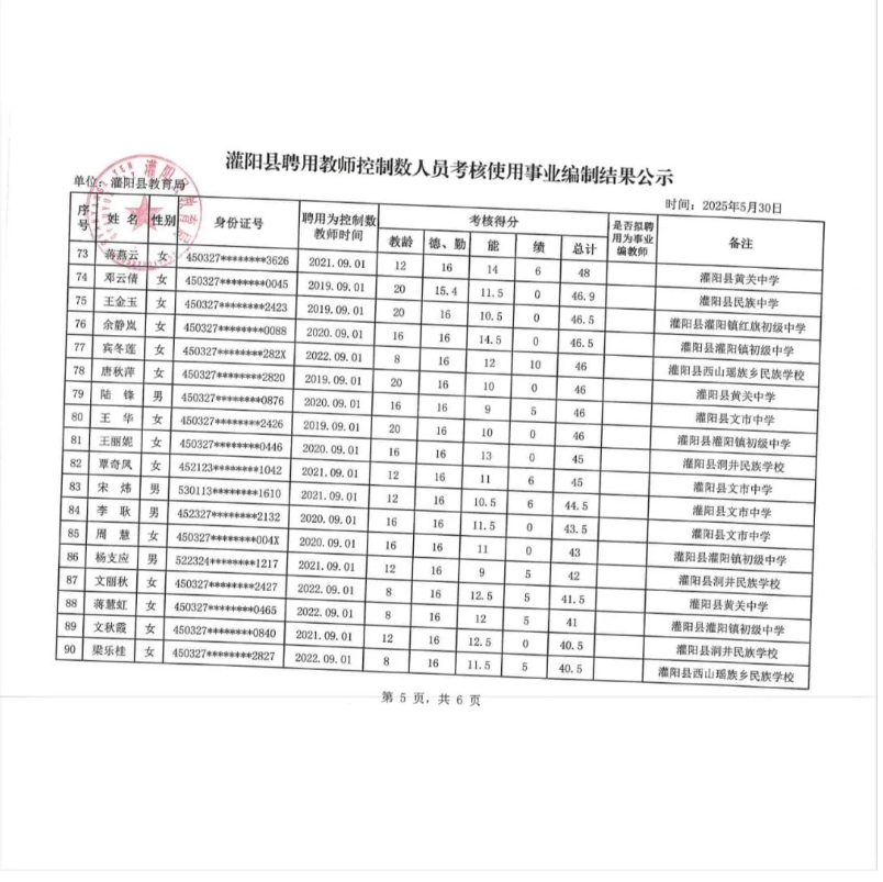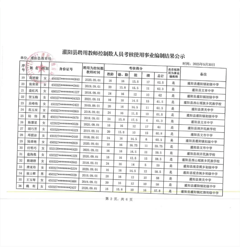 灌陽縣聘用教師控制數人員考核使用事業編制結果公示