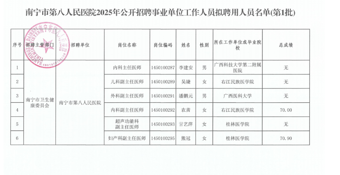 南寧市第八人民醫院2025年公開招聘事業單位工作人員擬聘用人員公示(第1批)