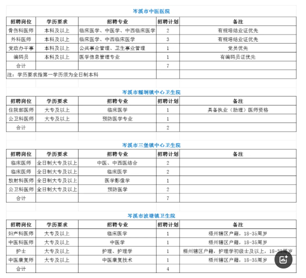 岑溪市中醫醫院2025年6月計劃招聘人才7名,岑溪市中醫醫院醫共體成員單位共計招聘人才12名。
