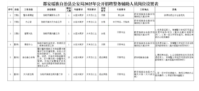 都安瑤族自治縣公安局本次擬招聘警務輔助人員30人,具體招聘崗位、人數、資格條件詳見《都安瑤族自治縣公安局2025年公開招聘警務輔助人員崗位設置表》