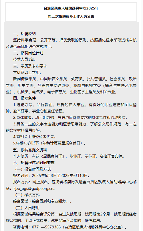 原文標題:自治區殘疾人輔助器具中心2025年第二次招聘編外工作人員公告