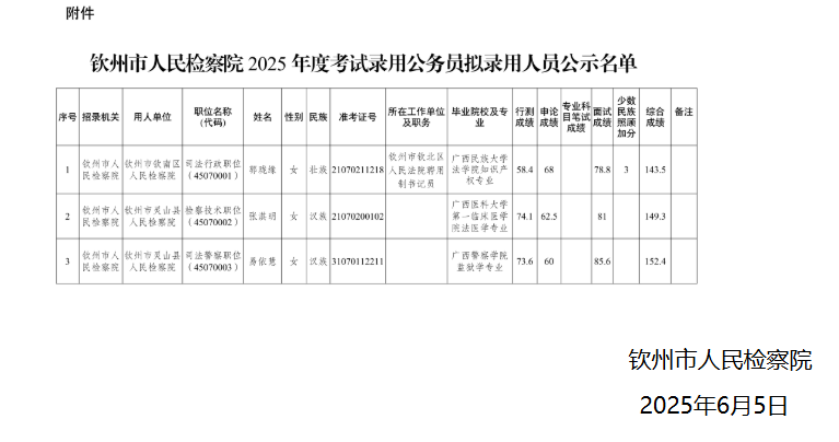 欽州市人民檢察院2025年度考試錄用公務員擬錄用人員公示