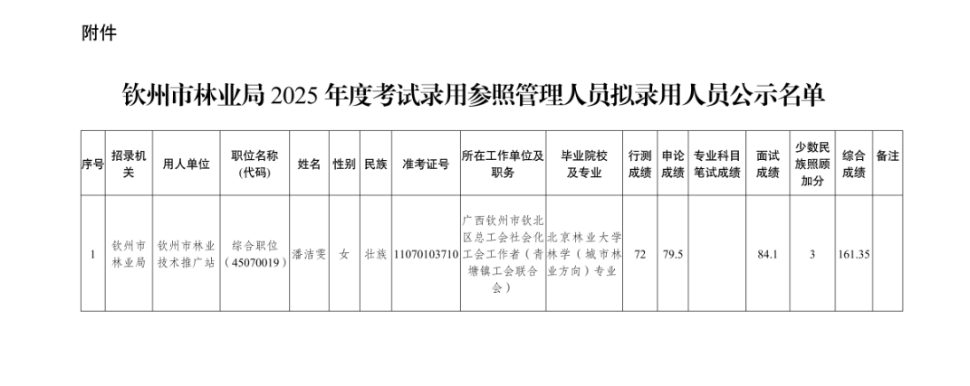 附件:欽州市林業局2025年度考試錄用參照管理人員擬錄用人員公示名單