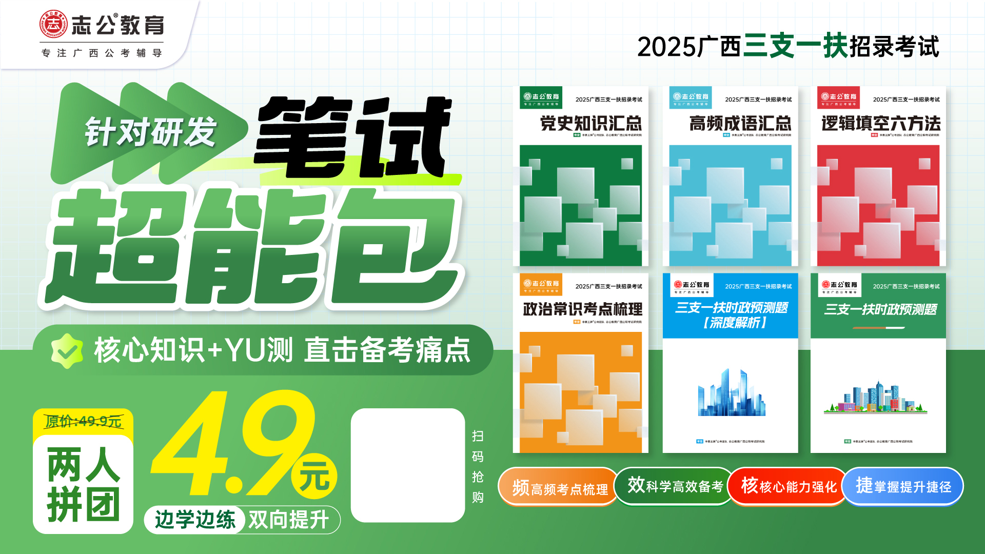 為助力青年群體高效備考,小志基于廣西地區歷年考試真題和考情分析,針對廣西地區“三支一扶”考試特點,精準把握命題趨勢。內容緊扣考試大綱,覆蓋綜合知識、公共基礎知識及崗位相關實務,幫助考生高效掌握核心考點,為考生提供系統化、精準化的備考支持。