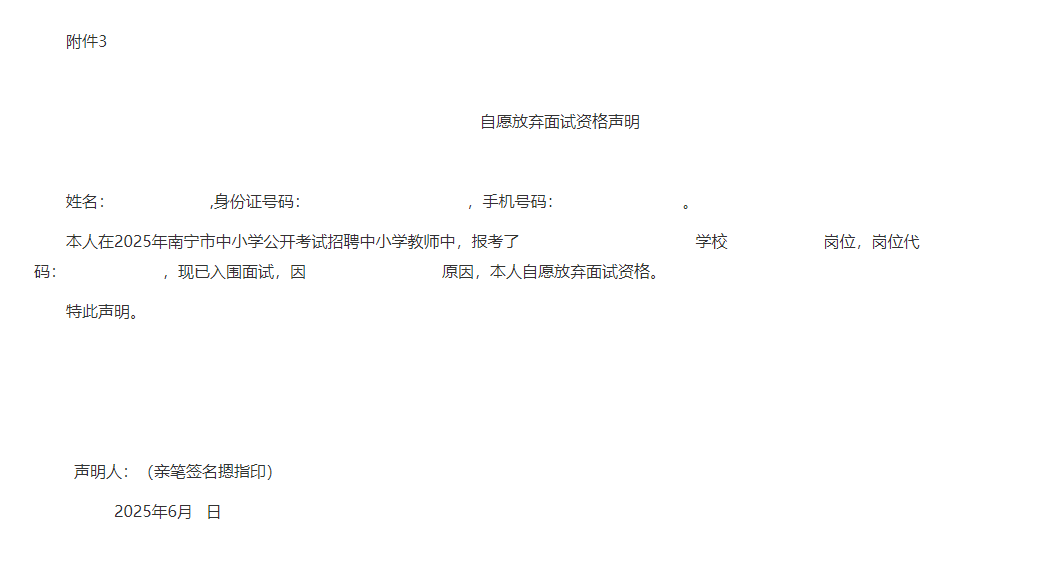 (四)放棄面試資格的報考人員,應及時向面試資格復審單位提供書面放棄面試資格說明材料(詳見附件3,包含:報考單位、崗位名稱和代碼、注明身份證號碼、手機號碼、本人簽名捺手印,材料可傳真或掃描發送郵箱:rs8223408@126.com),否則按相關規定處理。