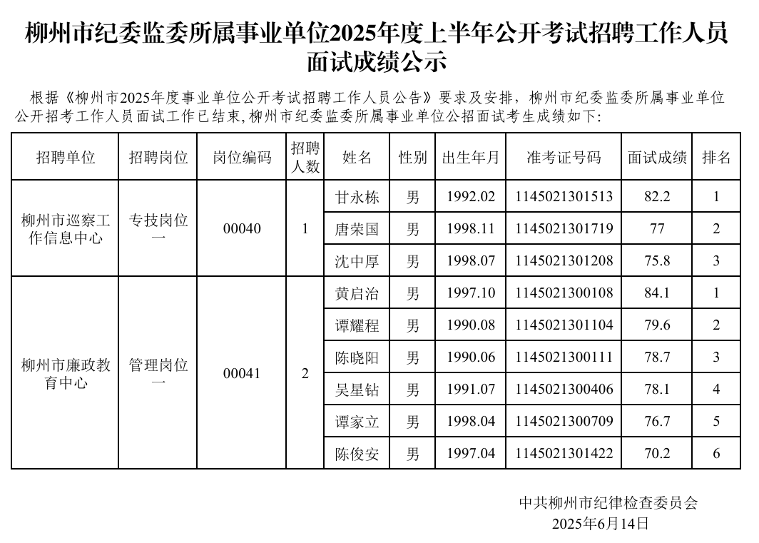 原文標題:柳州市紀委監委所屬事業單位2025年度上半年公開考試招聘工作人員面試成績公示