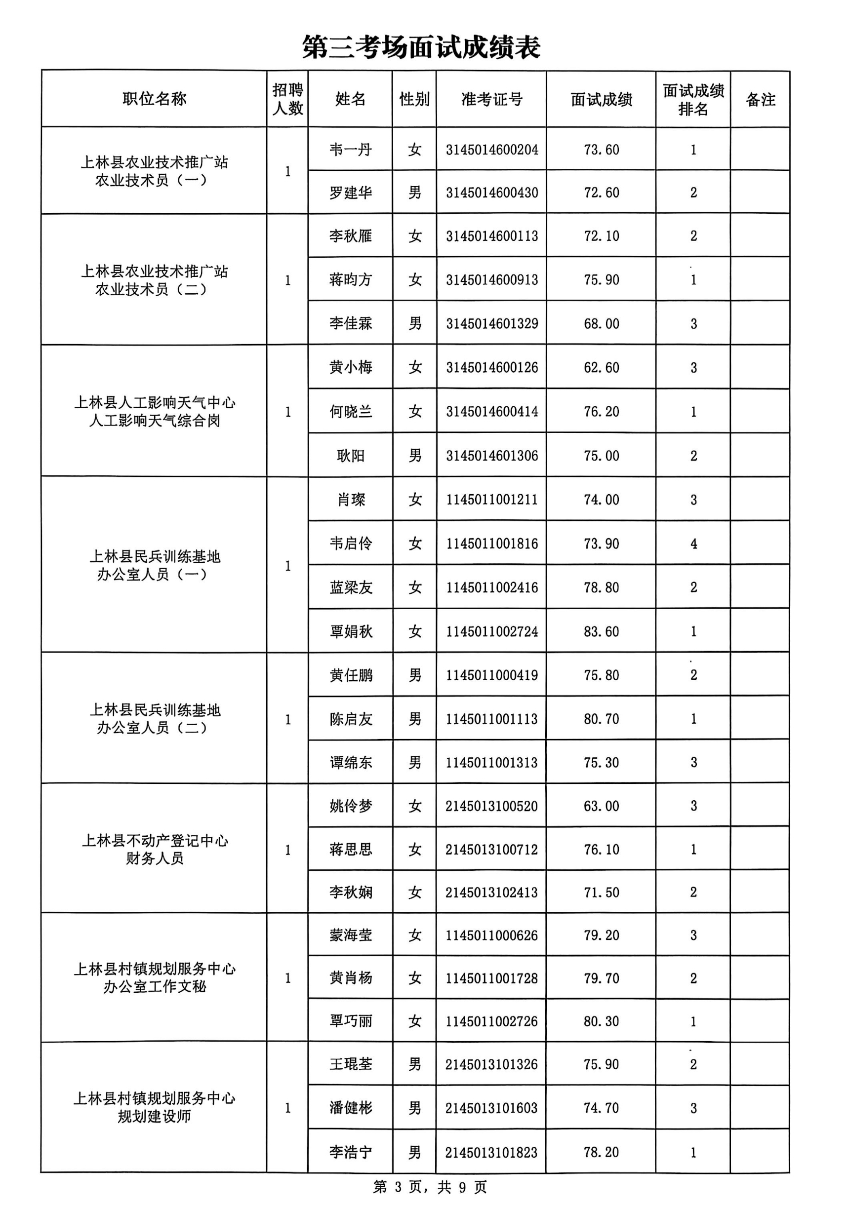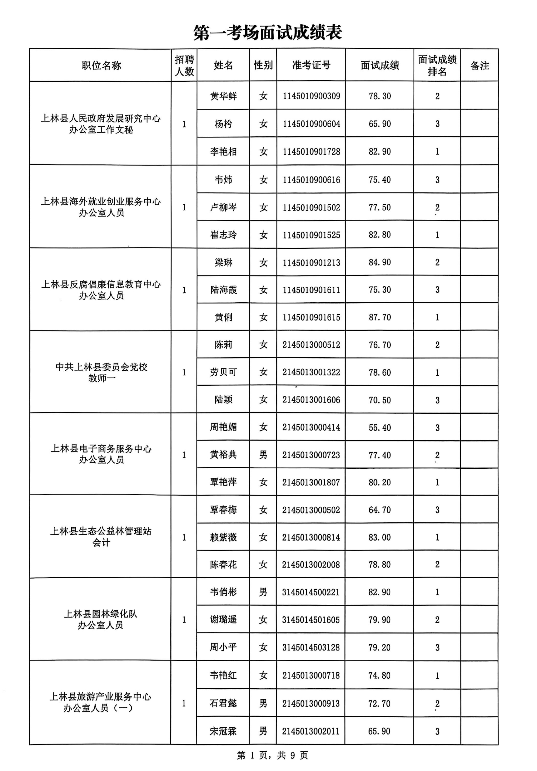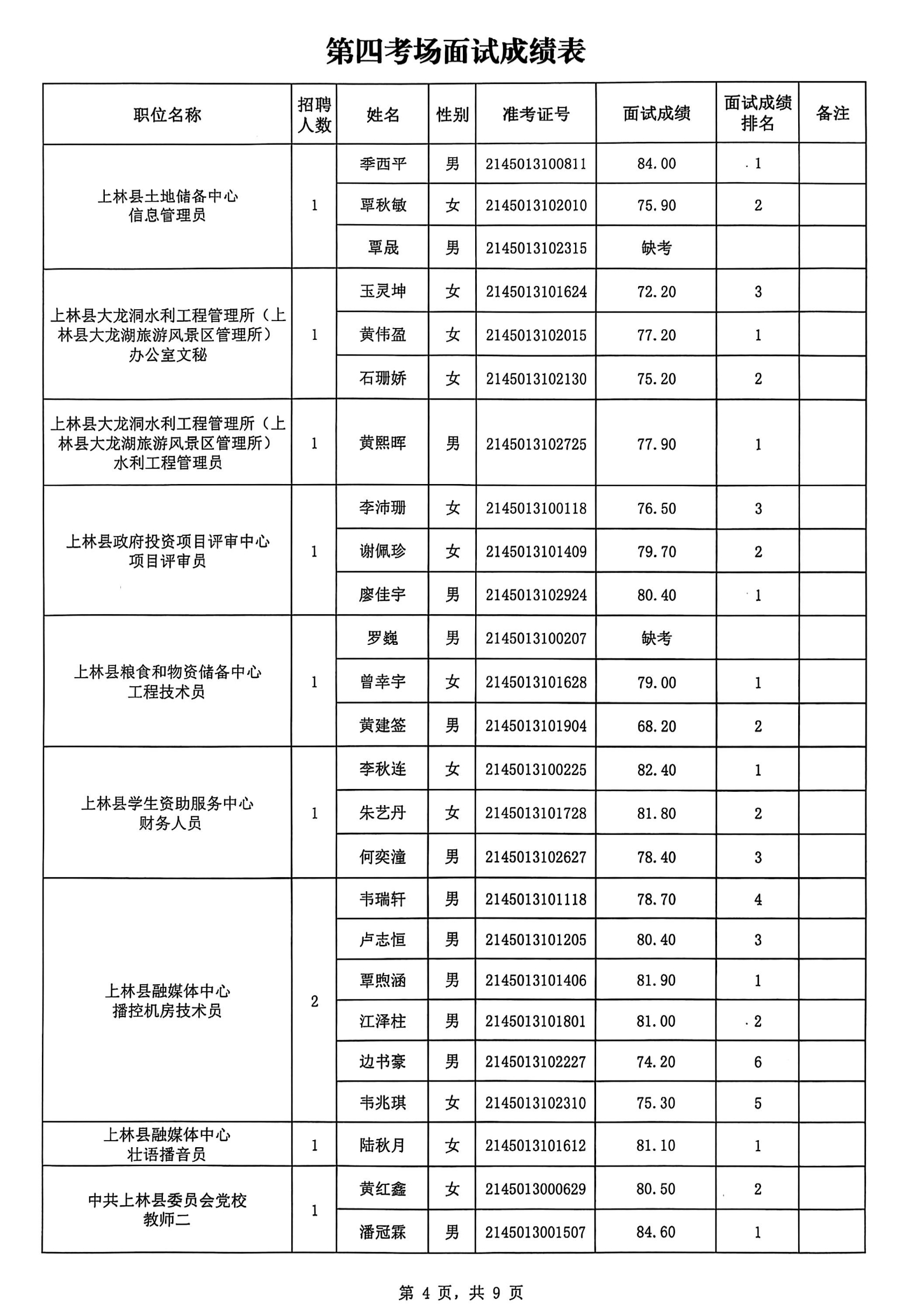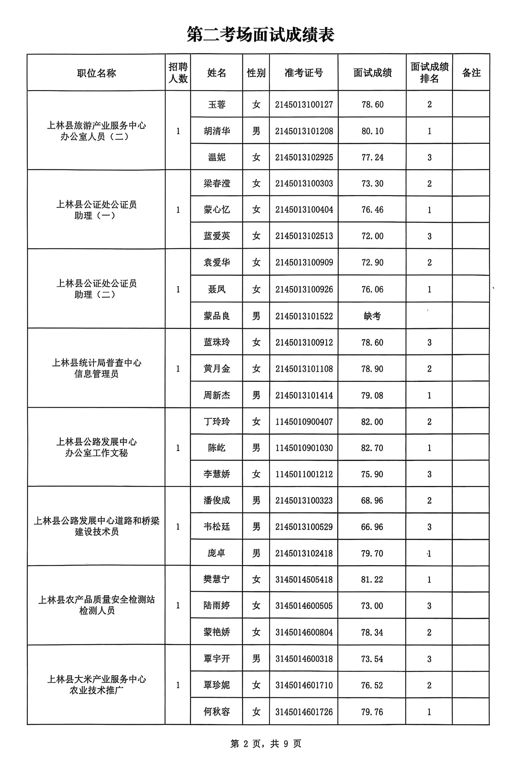 上林縣2025年公開考試招聘事業單位工作人員面試成績公布如下: