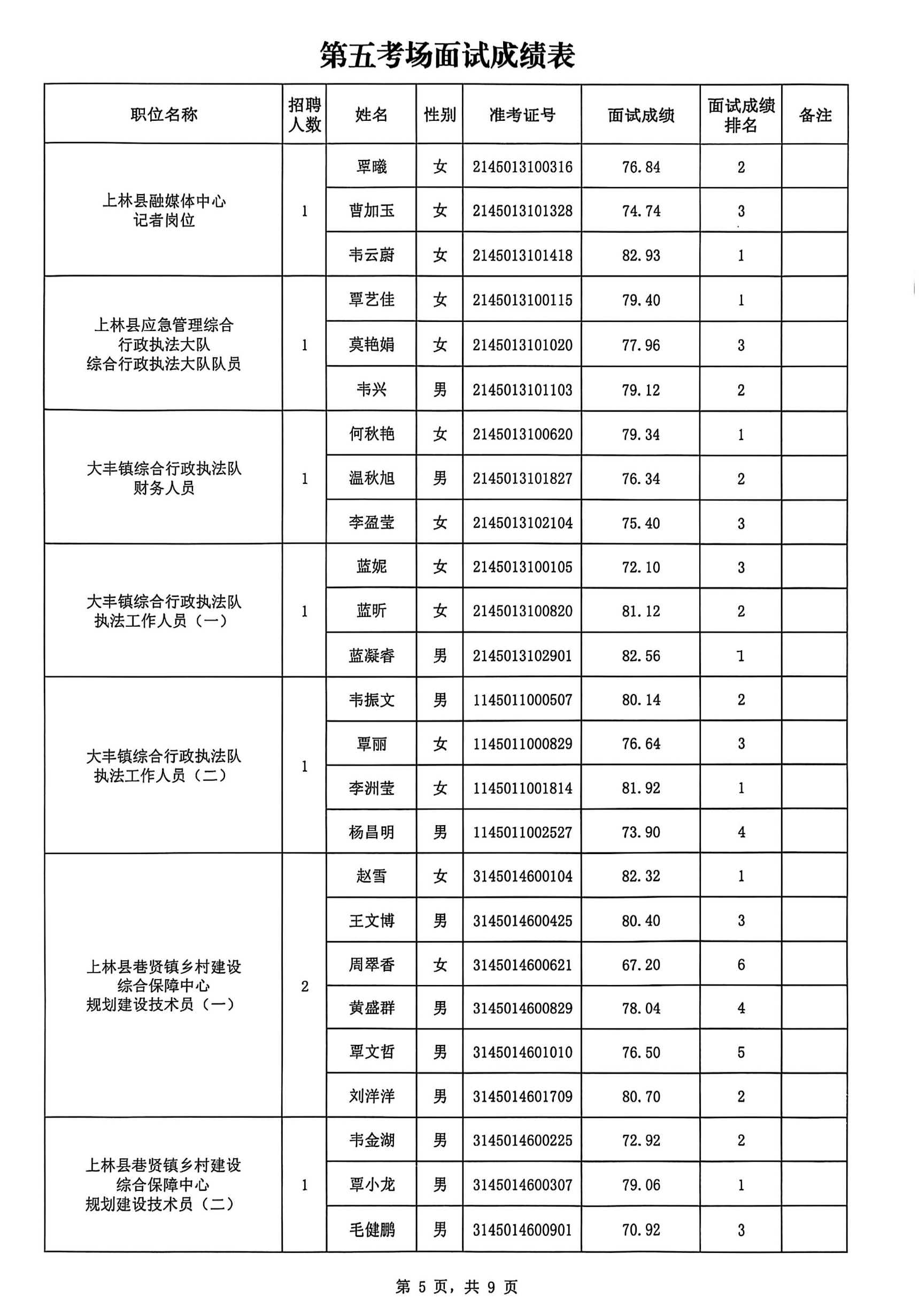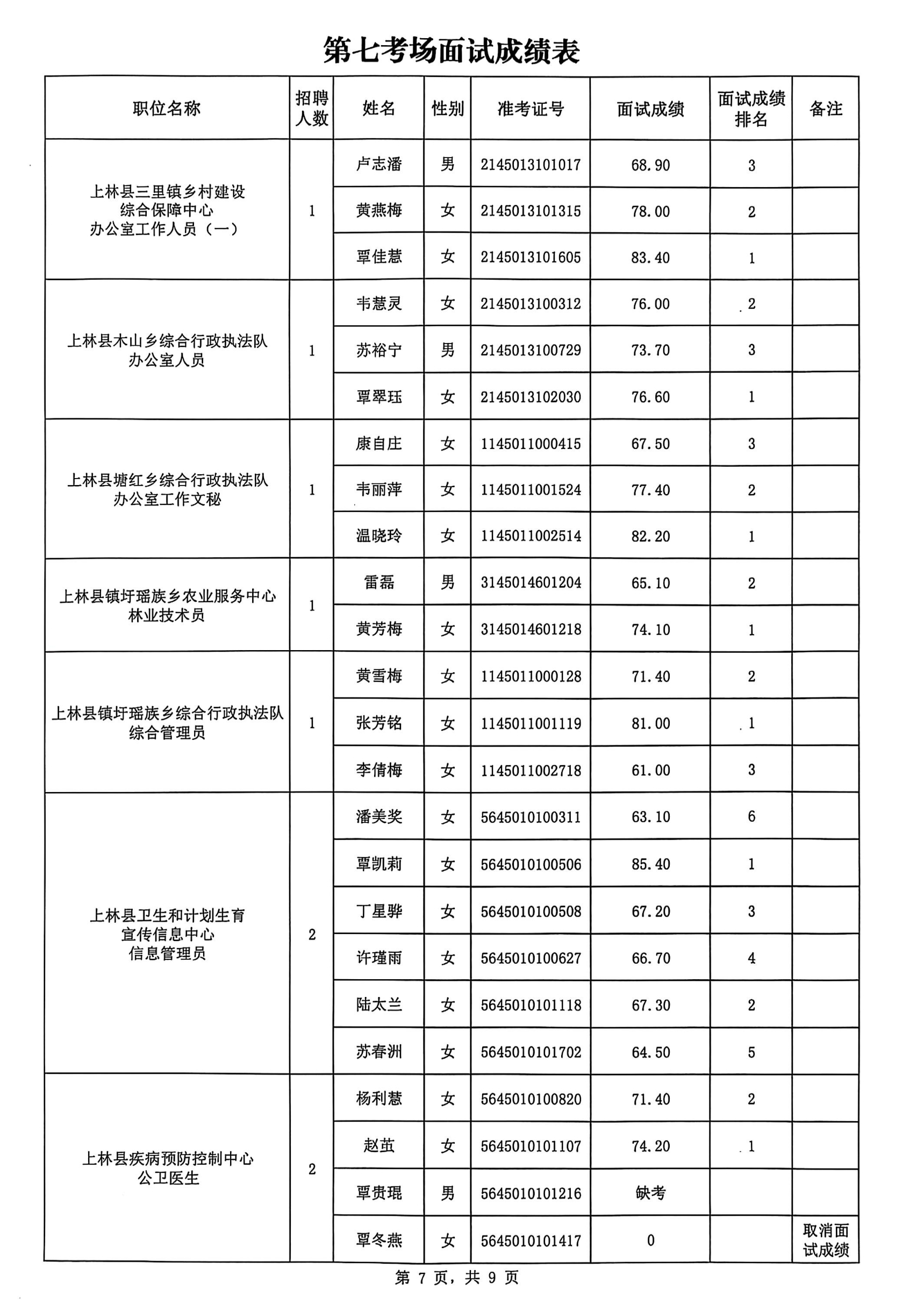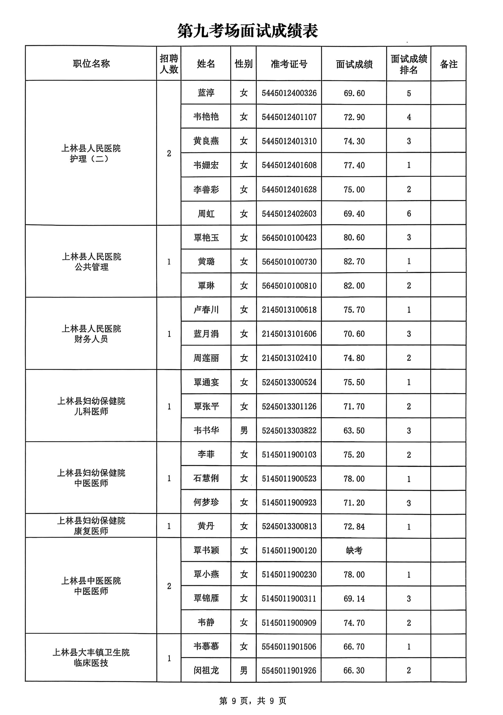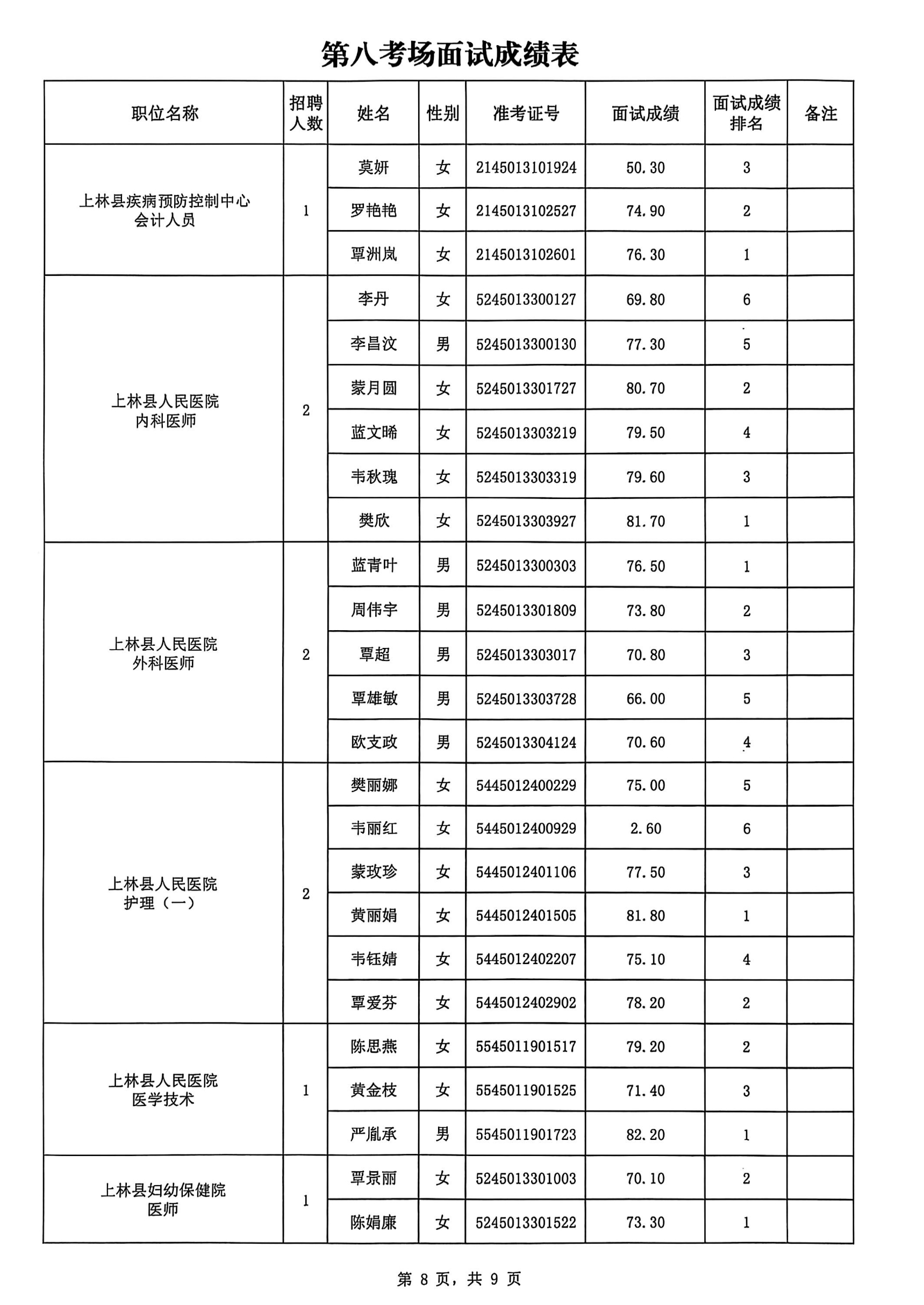 上林縣2025年公開考試招聘事業單位工作人員面試成績公布如下: