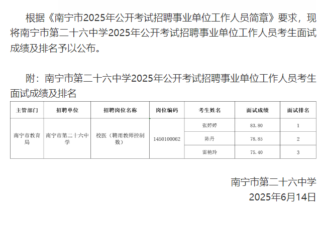 南寧市第二十六中學關于公布2025年公開考試招聘事業(yè)單位工作人員考生面試成績及排名的公告