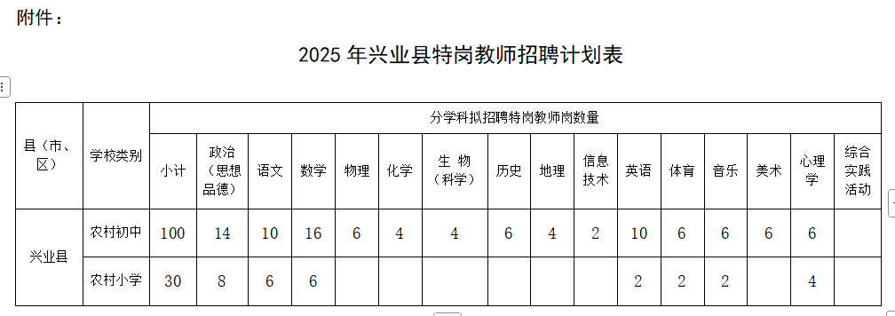 2025年我縣計劃招聘農村義務教育階段學校特崗教師130名,其中:小學30名、初中100名。具體崗位計劃見附件《2025年興業縣特崗教師招聘計劃表》。