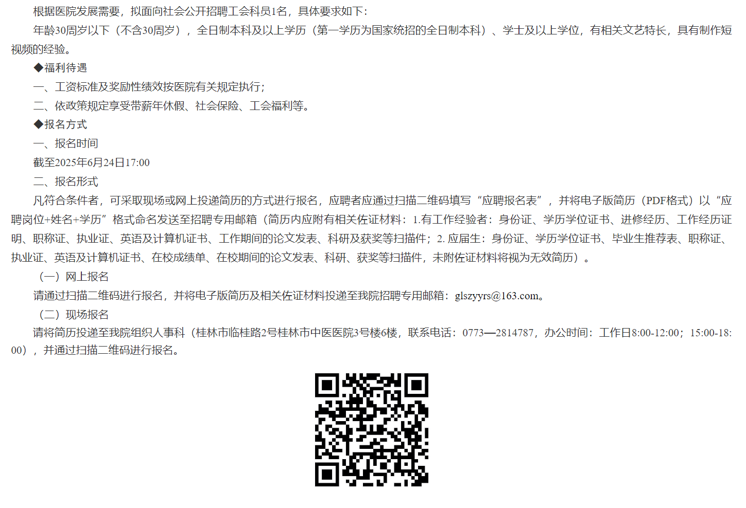 2025年桂林市中醫醫院工會科員招聘1人