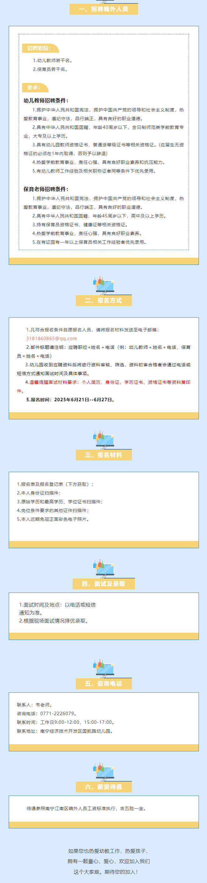2025年南寧經濟技術開發區國凱路幼兒園招聘編外人員若干人