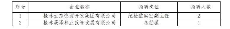 根據(jù)桂林生態(tài)資源開(kāi)發(fā)集團(tuán)有限公司經(jīng)營(yíng)管理和發(fā)展需要,現(xiàn)面向社會(huì)公開(kāi)招聘集團(tuán)本部及下轄子公司2個(gè)崗位人員,有關(guān)事項(xiàng)公告如下: