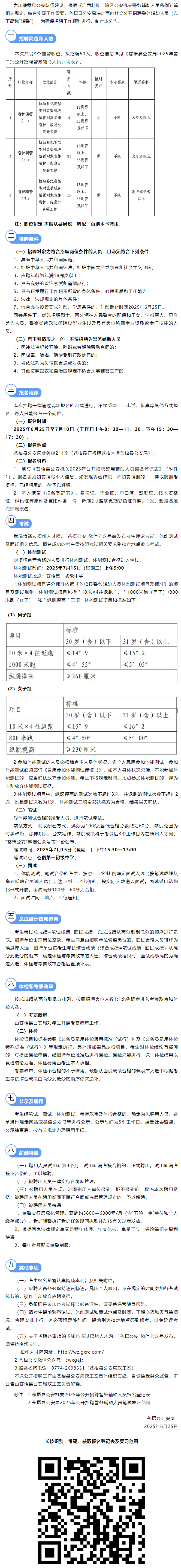 2025年蒼梧縣公安局第二批公開招聘警務輔助人員50人