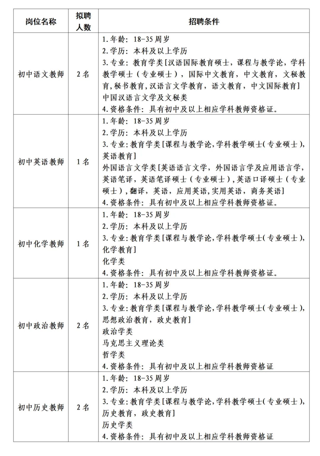 (六)18周歲以上、35周歲以下。有教學經驗豐富、碩士研究生或中級職稱以上的應聘人員,年齡可適當放寬到45周歲。