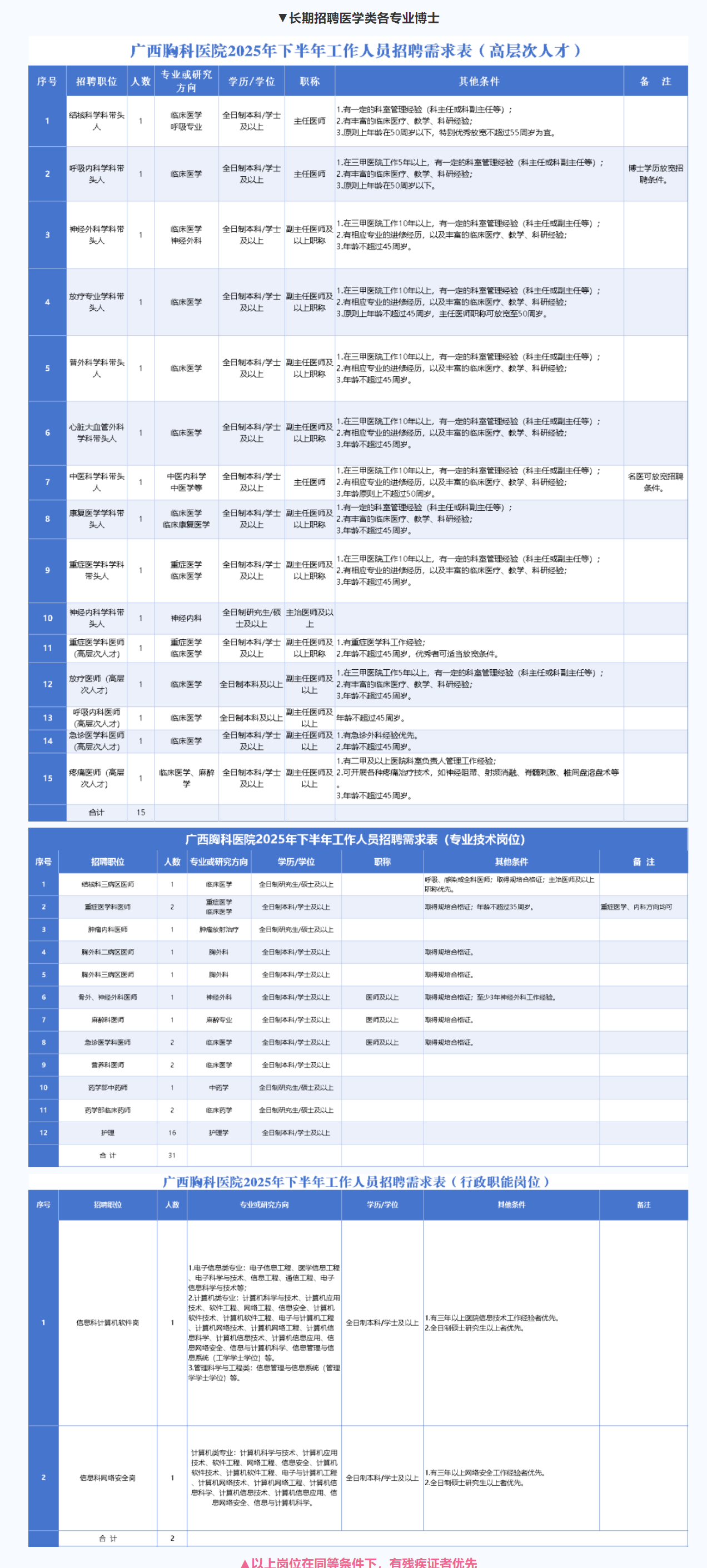 2.網上報名:請將招聘報名表及個人信息匯總表(詳見附件)、個人簡歷、身份證、學歷學位證、大學英語四六級考試成績報告單、在校期間成績單、資格證、執業證、住院醫師規范化培訓合格證、獲獎證書電子版打包發送到廣西壯族自治區胸科醫院人事科郵箱gxltyyrsk@126.com。郵件統一命名格式為“崗位+學歷+姓名”,例如:“呼吸內科醫師+全日制本科+姓名”。