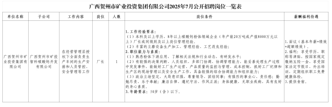 1.廣西賀州市礦業投資集團有限公司2025年7月公開招聘崗位一覽表