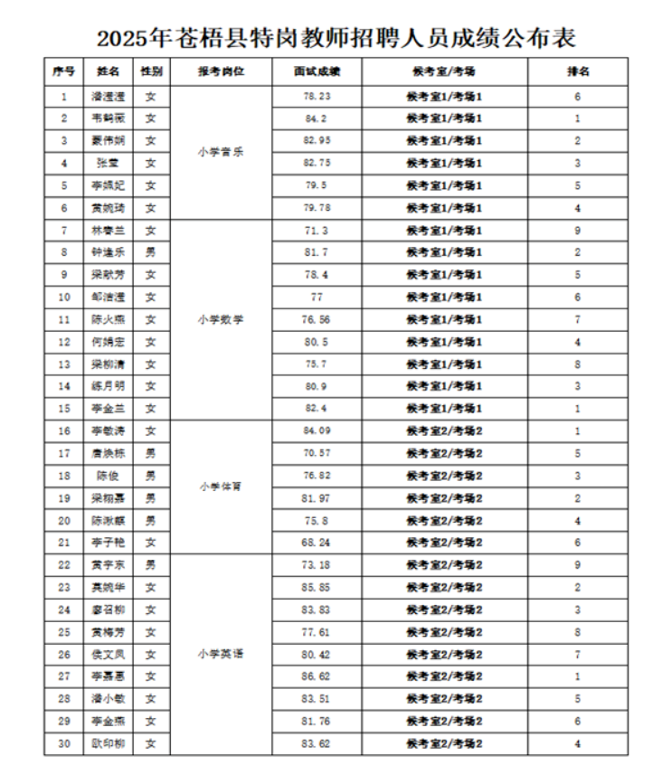 2025年蒼梧縣特崗教師招聘人員面試成績公布