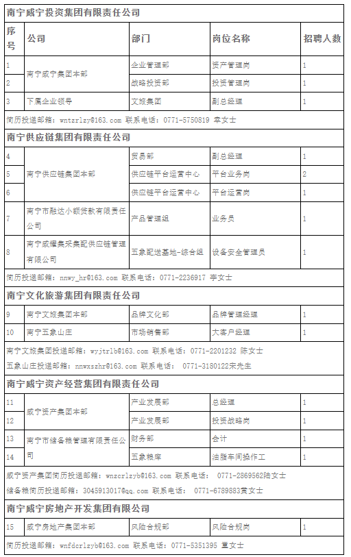 南寧威寧投資集團有限責任公司現因集團業務高速發展需要,集團本部及各下屬企業誠邀各類優秀人才加盟,公司將提供完善的激勵晉升機制及廣闊的發展空間。熱忱歡迎有志之士加盟,公司將為您提供完善的激勵晉升機制及廣闊的發展平臺,招聘崗位、人數及崗位要求詳見附件。