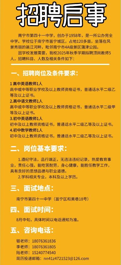 原文標題:2025年秋季學期南寧市第四十一中學關于公開招聘頂崗教師的啟事