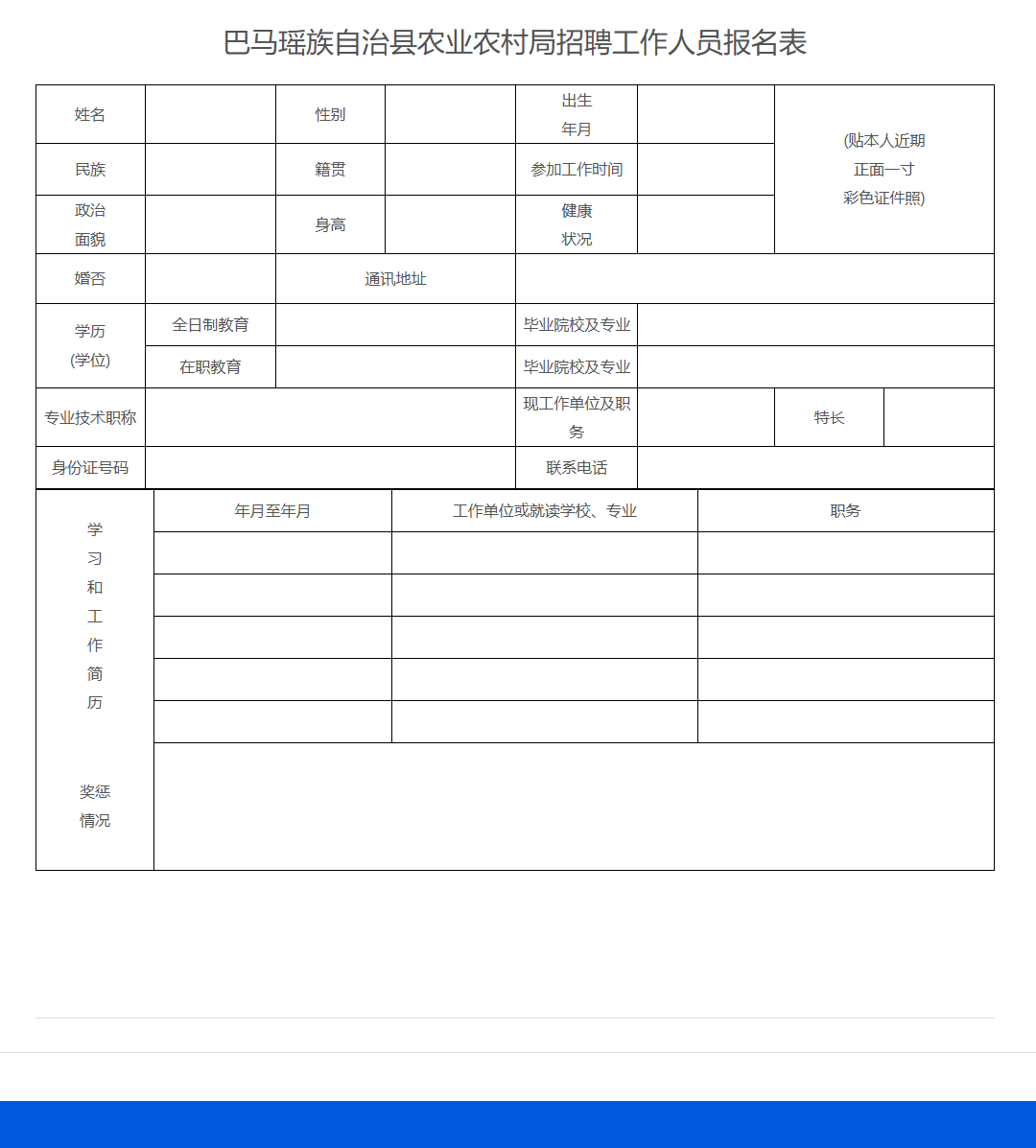 (1)《巴馬瑤族自治縣農(nóng)業(yè)農(nóng)村局招聘工作人員報(bào)名表》1份(詳見附件);