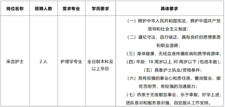 報名所需材料:《河池市中心血站公開招聘報名表》(附件)、個人簡歷、畢業(yè)證書、學(xué)位證書、護士執(zhí)業(yè)證/資格證、身份證等,若個人具備特長,需一并附上相關(guān)佐證材料。請攜帶以上材料原件及復(fù)印件至指定報名地點。應(yīng)聘人員應(yīng)對報名材料的真實性負責(zé),凡弄虛作假的,一經(jīng)查實,即取消報名和聘用資格。