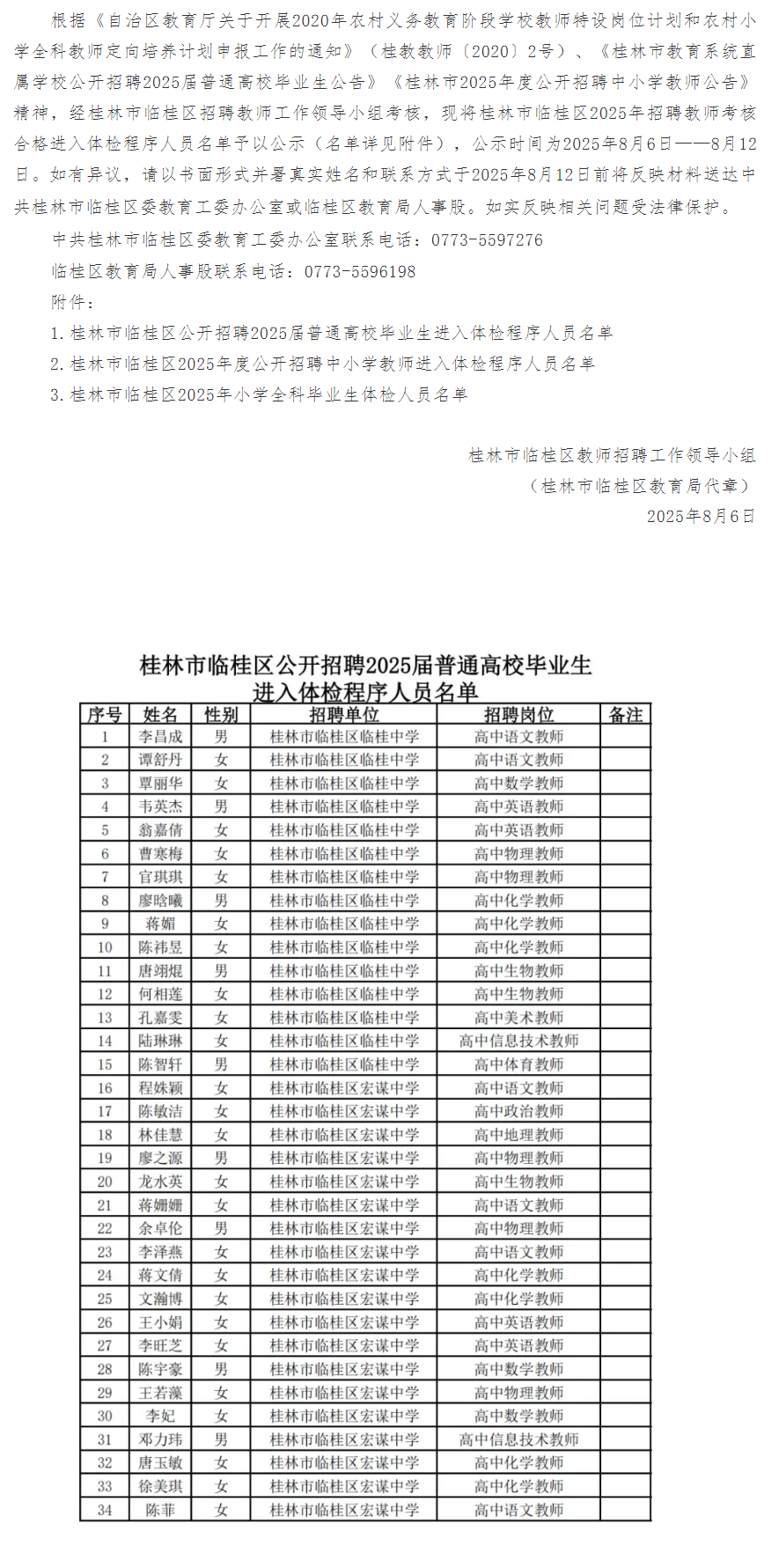 文章來源:桂林市臨桂區2025年招聘教師考核合格進入體檢程序人員名單公示