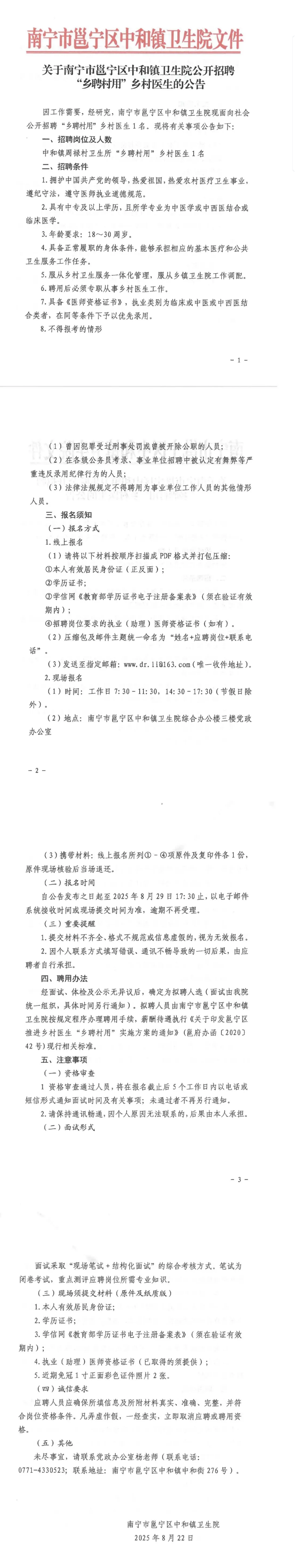 原文標題:南寧市邕寧區中和鎮衛生院公開招聘“鄉聘村用”鄉村醫生的公告