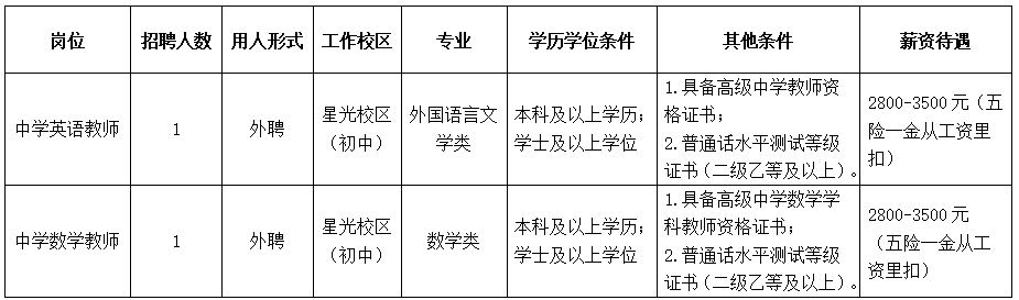 根據學校工作需要,南寧市第十中學星光校區(初中部)面向社會招聘教職工,具體崗位如下: