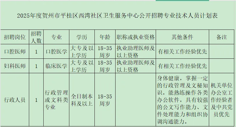 原文標題:賀州市平桂區西灣社區衛生服務中心招聘公告