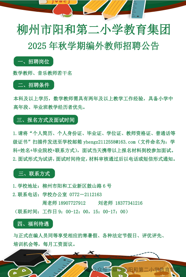 原文標題:柳州市陽和第二小學教育集團2025年秋學期編外教師招聘公告