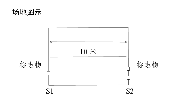 場(chǎng)地器材:場(chǎng)地為10米長(zhǎng)的直線跑道,在跑道的兩端各劃一條5cm寬直線(S1S2),將木塊(10cm×5cm×5cm)按每道3塊豎立擺放(其中2塊放在S2線上,1塊放在S1線上),秒表若干塊。