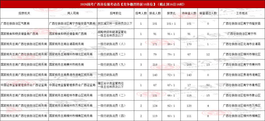 我們接著來看廣西地區國考報名競爭最激烈的前十職位匯總情況。當前,國家稅務總局廣西壯族自治區稅務局-國家稅務總局桂林市臨桂區稅務局的【一級行政執法員(三)】 職位,以220人的報名數成為目前前十職位中最熱門的選擇。