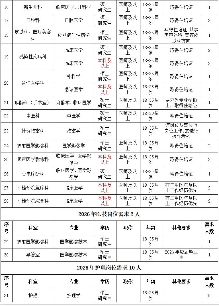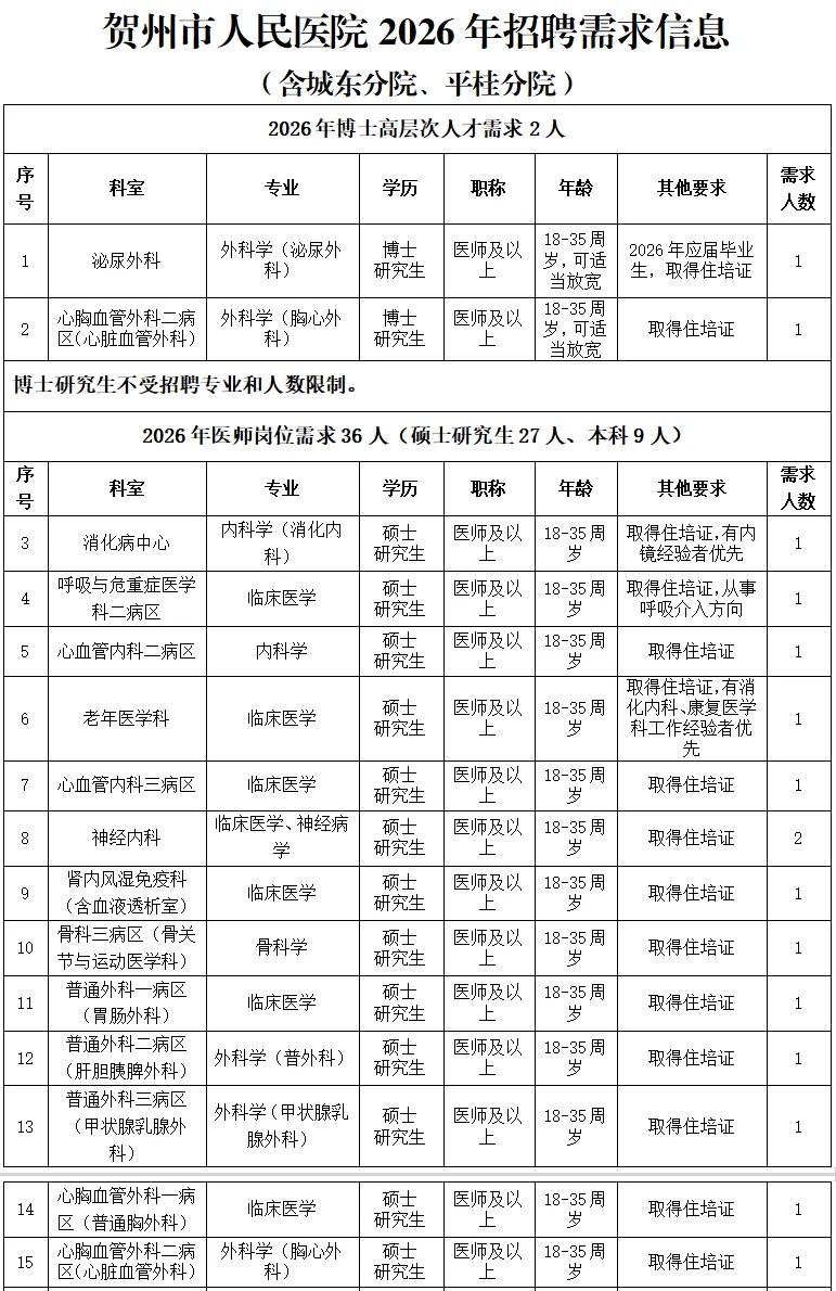 根據醫院發展規劃,招聘工作堅持公平公正公開,堅持德才兼備、人崗相適、擇優錄取、雙向選擇的原則,2026年計劃引進博士、碩士高層次人才及招聘工作人員共計50名(詳見附件:賀州市人民醫院2026年招聘需求信息)。